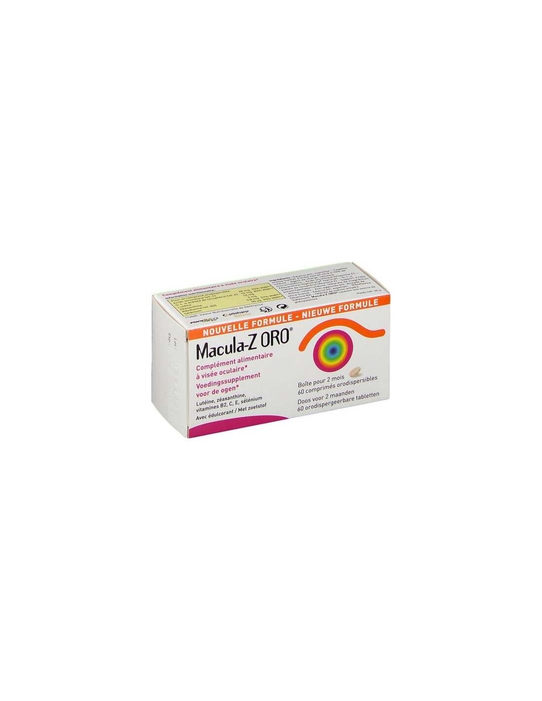MACULAMacula-Z ORO® es un complemento alimenticio cuya composición permite un aporte razonable de antioxidantes. La vitamina B2 contribuye al mantenimiento de una visión normal. La luteína es uno de los componentes de la retina y del cristalino. La luteína y la zeaxantina son dos pigmentos amarillos de la familia de los carotenoides esenciales, ya que no son sintetizados por el organismo humano. El selenio contribuye a proteger a las células frente al daño oxidativo. Macula-Z ORO® se presenta en forma de comprimido bucodispersable. Se disgrega en pocos segundos dentro de la boca, eliminando de este modo cualquier riesgo de vía equivocada. La toma de Macula-Z ORO® facilita la ingesta, en particular a las personas que tienen dificultades para deglutir o que padecen disfagia.