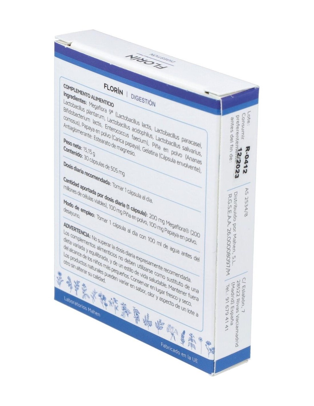 Megaflora 9 (Lactococcus lactis, Lactobacillus paracasei, Lactobacillus plantarum, Lactobacillus acidophilus, Lactobacillus salivarius, Bifidobacterium lactis, Enterococcus faecium), Piña en polvo (Ananas comosus) Papaya en polvo (Carica papaya)