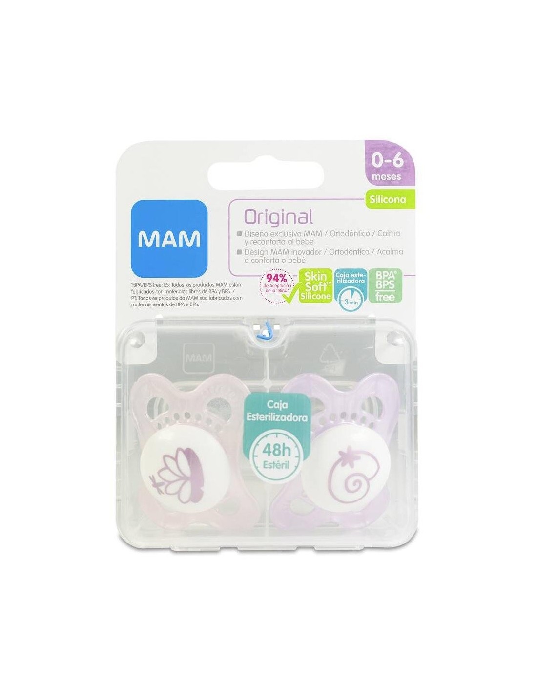 MAMTetina simétrica de silicona anatómicamente correcta para el desarollo de la mandíbula y los dientes del bebé, con recubrimiento tacto seda ultra suave con un 94% de aceptación. Chupetes ortodónticos con elementos de diseño en color rosaTetina simétrica de silicona anatómicamente correcta para el desarollo de la mandíbula y los dientes del bebé, con recubrimiento tacto seda ultra suave con un 94% de aceptación.