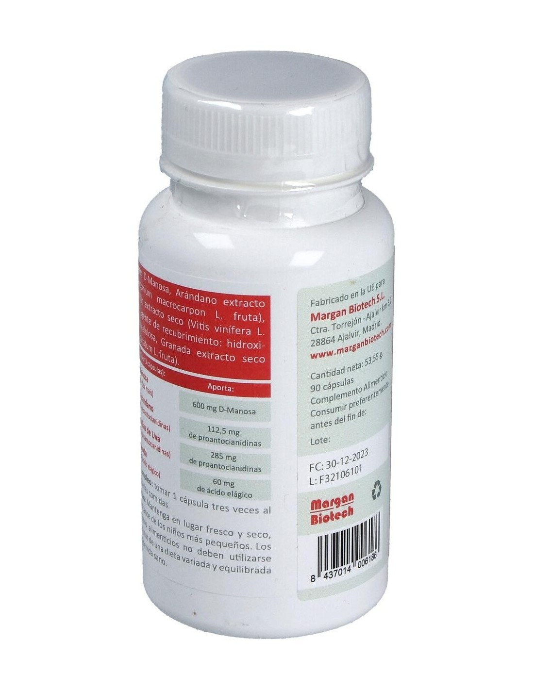 D-Manosa, extracto seco de semillas de Uva (Vitis Vinífera L. semillas): agente de recubrimiento: hidroxipropilmetilcelulosa: extracto seco de Granada (Punica granatum L. fruta): extracto seco de bayas de Arándano (Vaccinium myrtillus L. fruta).
