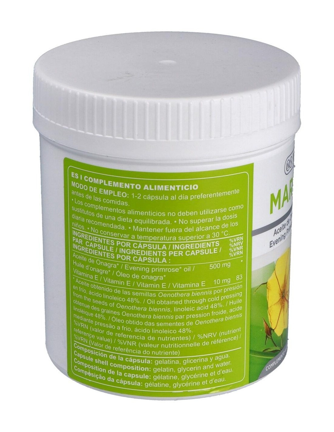 Aceite de Onagra prensado en frío 500 mg. Vitamina E 10 mg. Composición de la cápsula: Gelatina, glicerina y agua.
