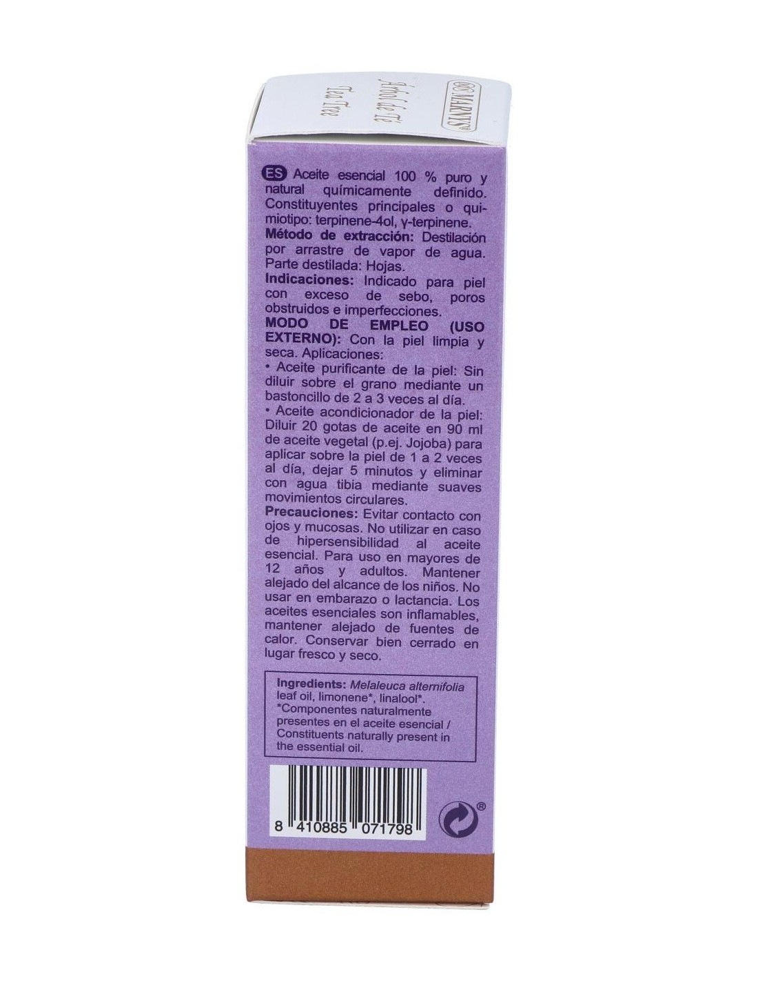 Marnys aceite esencial árbol del té es un aceite antiséptico y antibacteriano de amplio espectro. Gracias a sus principios activos se utiliza como remedio al acné y en heridas, quemaduras, verrugas, pie de atleta, combate el olor de pies, revitalizante, estimulante y tonificante.