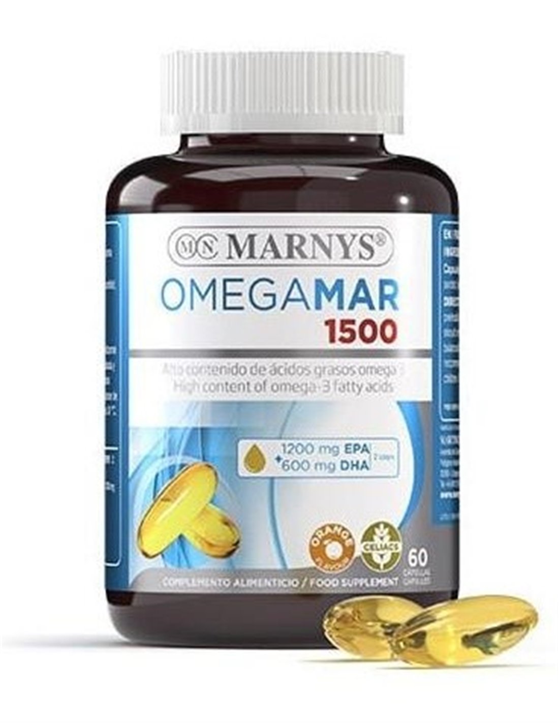 MARNYSMARNYS® OMEGAMAR contiene EPA+DHA proveniente del aceite de pescado de anchoas, sardinas y caballa, los cuales poseen elevadas concentraciones de estos ácidos grasos. Además, los Omegas son obtenidos mediante la técnica de destilación molecular garantizando una calidad superior de DHA+EPA. Tanto el EPA como el DHA contribuyen al funcionamiento normal del corazón y a mantener la función cognitiva. Alta concentración de ácidos grasos Omega 3 con un suave sabor a naranja. Apto para celíacos. Omegamar 1500 está recomendado en adultos.