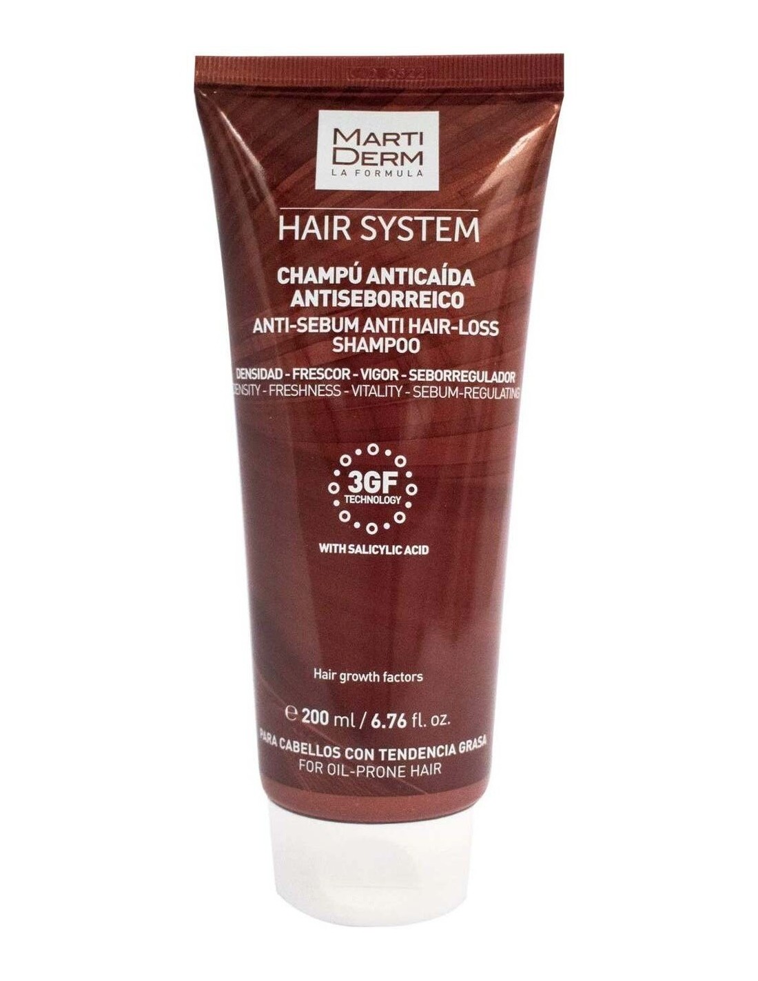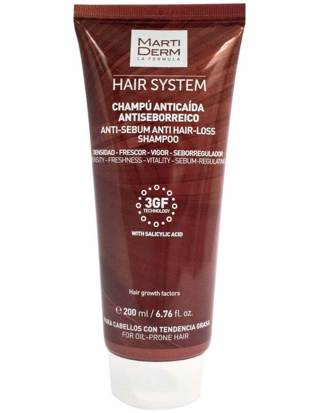 Martiderm champú anticaída antiseborreico es un champú que evita la caída del cabello relacionada con el exceso de grasa. Gracias a su formulación trata el desequilibrio producido por el sebo al mismo tiempo que evita que exista descamación en el cuero cabelludo. Formulado con una composición de factores de crecimiento que estimulan el crecimiento del cabello y evitan su caída.