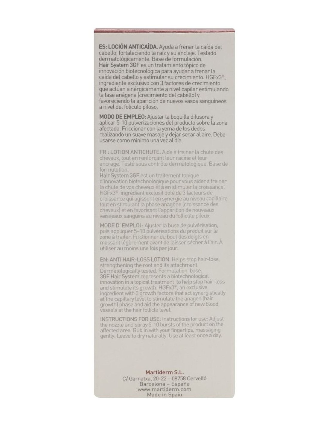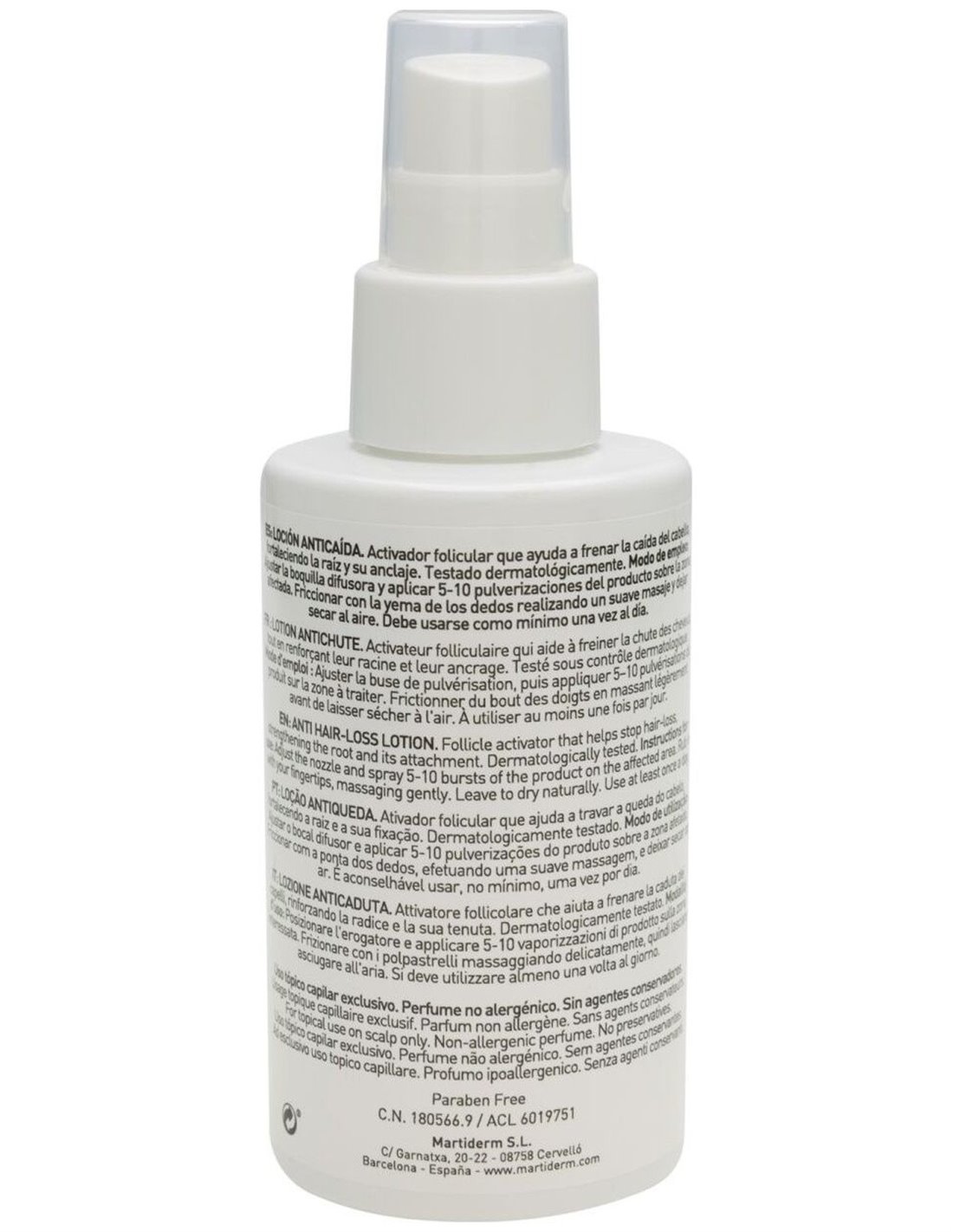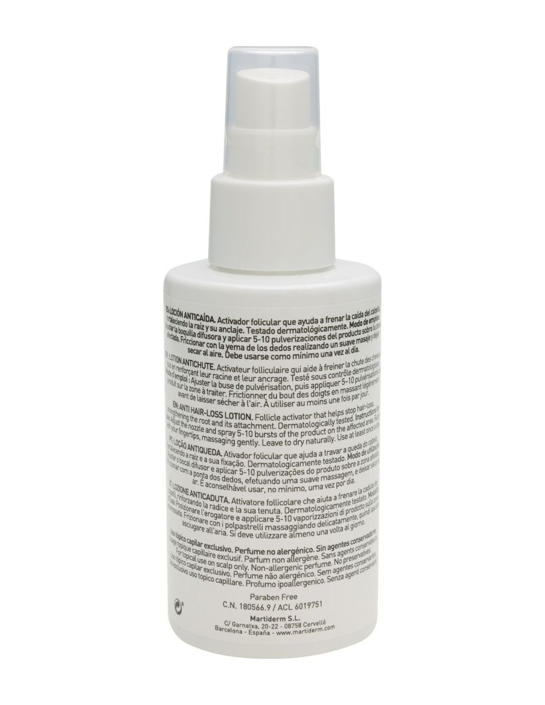 MARTIDERMAyuda a combatir los diferentes tipos de caída del cabello (alopecia androgenética y efluvio telógeno). Fortalece el cabello y mejora el anclaje al cuero cabelludo. Contiene tres factores de crecimiento, biotinil, ácido oleanoico, apigenina y vitamina B6, entre otros activos. Además, tiene ácido salicílico, con acción seborreguladora que elimina la grasa, de manera que libera los folículos pilosos de impurezas para reactivar el crecimiento del cabello.