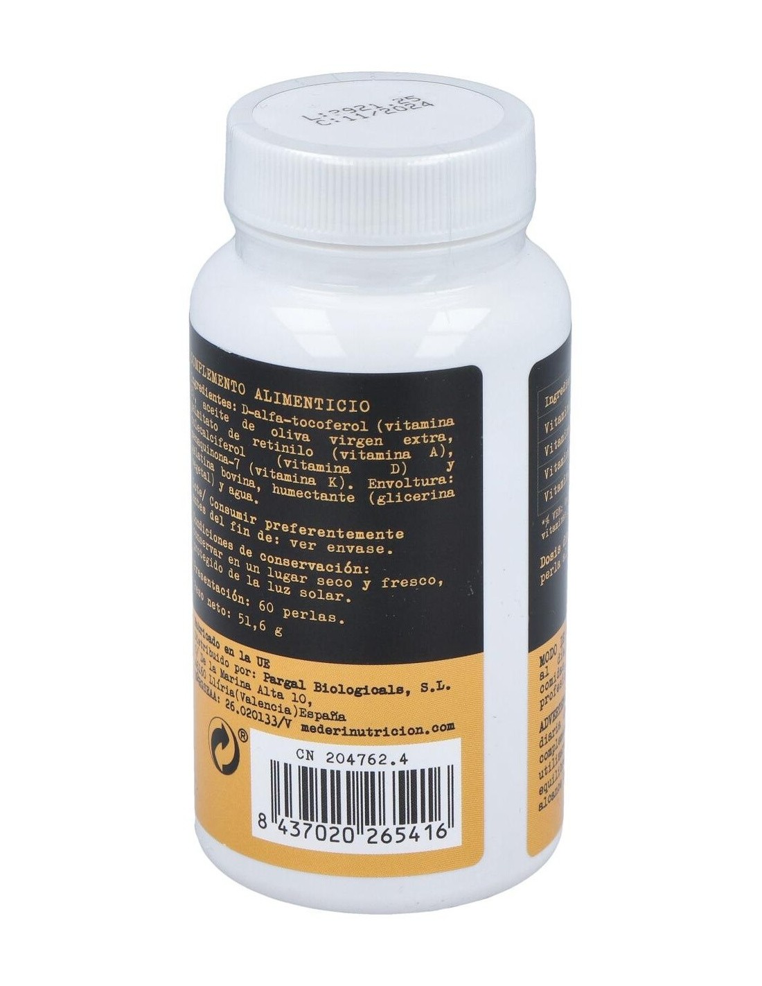 D-alfa-tocoferol (vitamina E), aceite de oliva virgen extra, palmitato de retinilo (vitamina A), colecalciferol (vitamina D) y menaquinona-7 (vitamina K). Envoltura: gelatina bovina, humectante (glicerina vegetal) y agua.