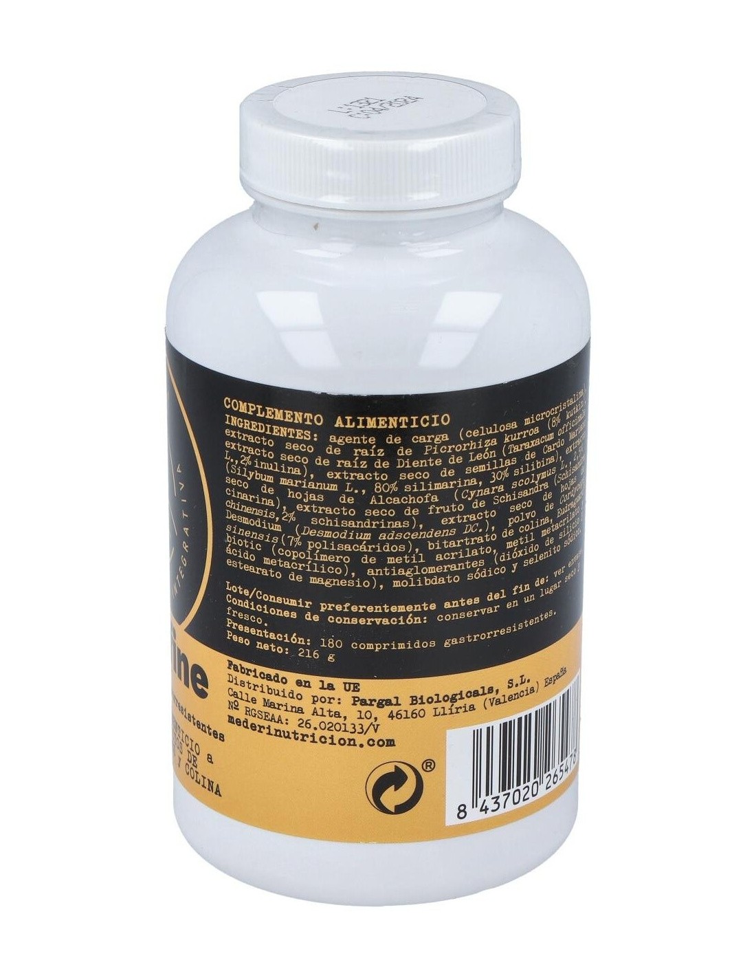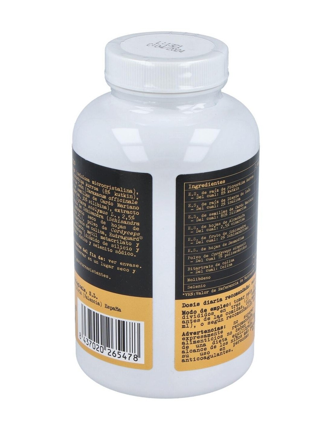 Agente de carga (celulosa microcristalina), extracto seco de raíz de Picrorhiza kurroa (8% kutkin), extracto seco de raíz de Diente de León (Taraxacum officinale L., 80% silimarina, 30% silibina), extracto seco de hojas de Alcachofa (Cynara scolymus L., 2,5% cinarina), extracto seco de fruto de Schisandra (Schisandra chinensis, 2% schisandrinas), extracto seco de hojas de Desmodium (Desmodium adscendens DC.), polvo de Cordyceps sinensis (7% polisacáridos), bitartrato de colina, Eudraguard© biotic (copolímero de metil acrilato, metil metacrilato y ácido metacrílico), antiaglomerantes (dióxido de silicio y estearato de magnesio), molibdato sódico y selenito sódico.