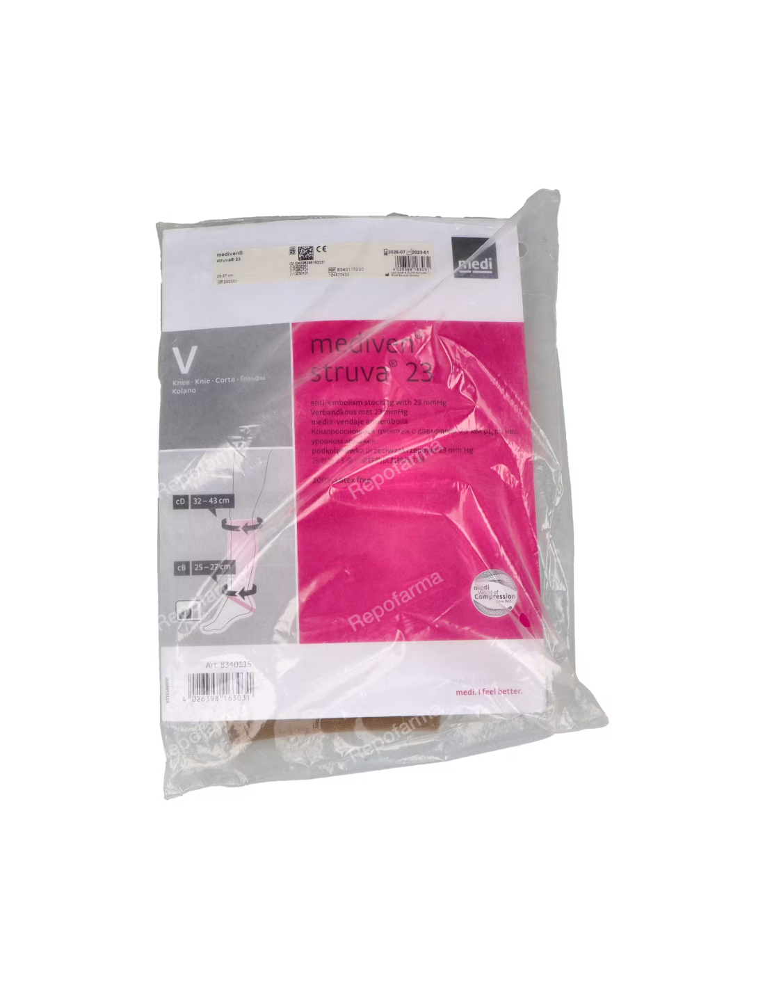 MEDIVENLas medias de vendaje tienen un campo de aplicación muy amplio para el tratamiento ambulatorio o en régimen de ingreso parcial de las trombosis en cirugía venosa y, en general, cuando se necesitan vendajes compresivos de las extremidades inferiores. Con una presión de 23 mmHg en el empeine, que va disminuyendo uniformemente hacia el muslo, mediven struva 23 es especialmente adecuada para la compresión breve directa posquirúrgica tras una intervención en las venas. Favorece el retorno venoso y evita la aparición de edemas y derrames sanguíneos.