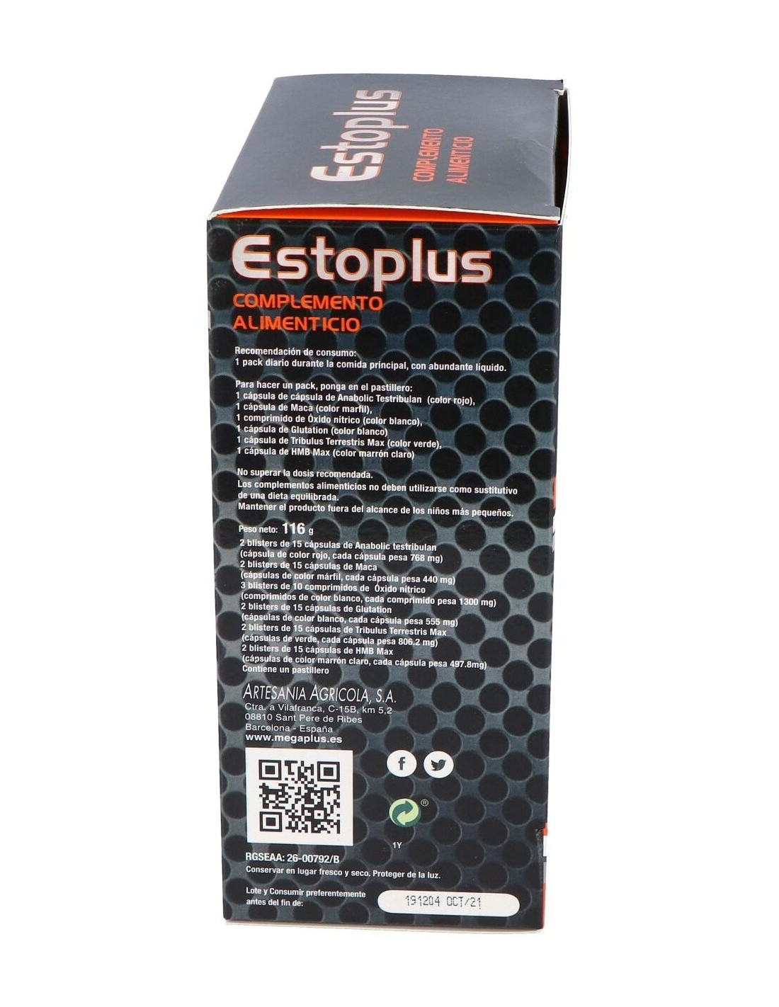 Ingredientes: ácido L-aspártico, tribulus terrestris (tribulus), cápsula [gelatina comestible, colorante (dióxido de titanio)], estabilizador (celulosa microcristalina), Lepidium meyenni (maca), avena sativa (avena), L-arginina, L-ornitina, L-lisina, emulgente (sales magnésicas de ácidos grasos), sulfato de cinc, antiaglomerante (dióxido de silicio), ácido trans-ferúlico natural, clorhidrato de piridoxina (vitamina B6).