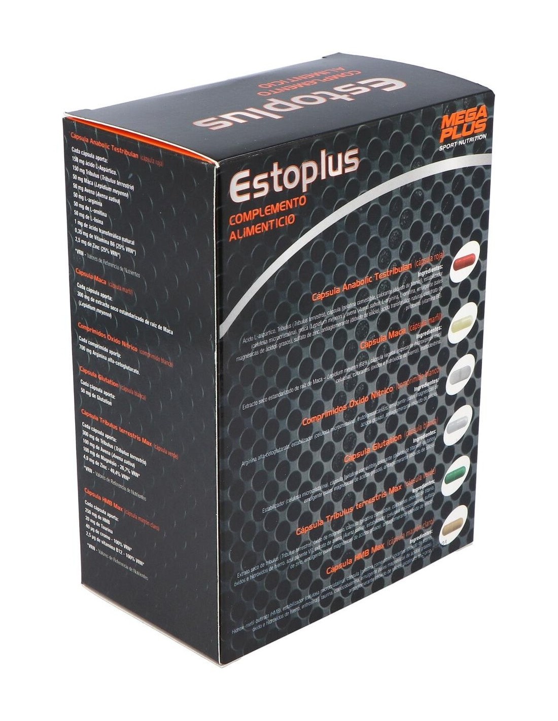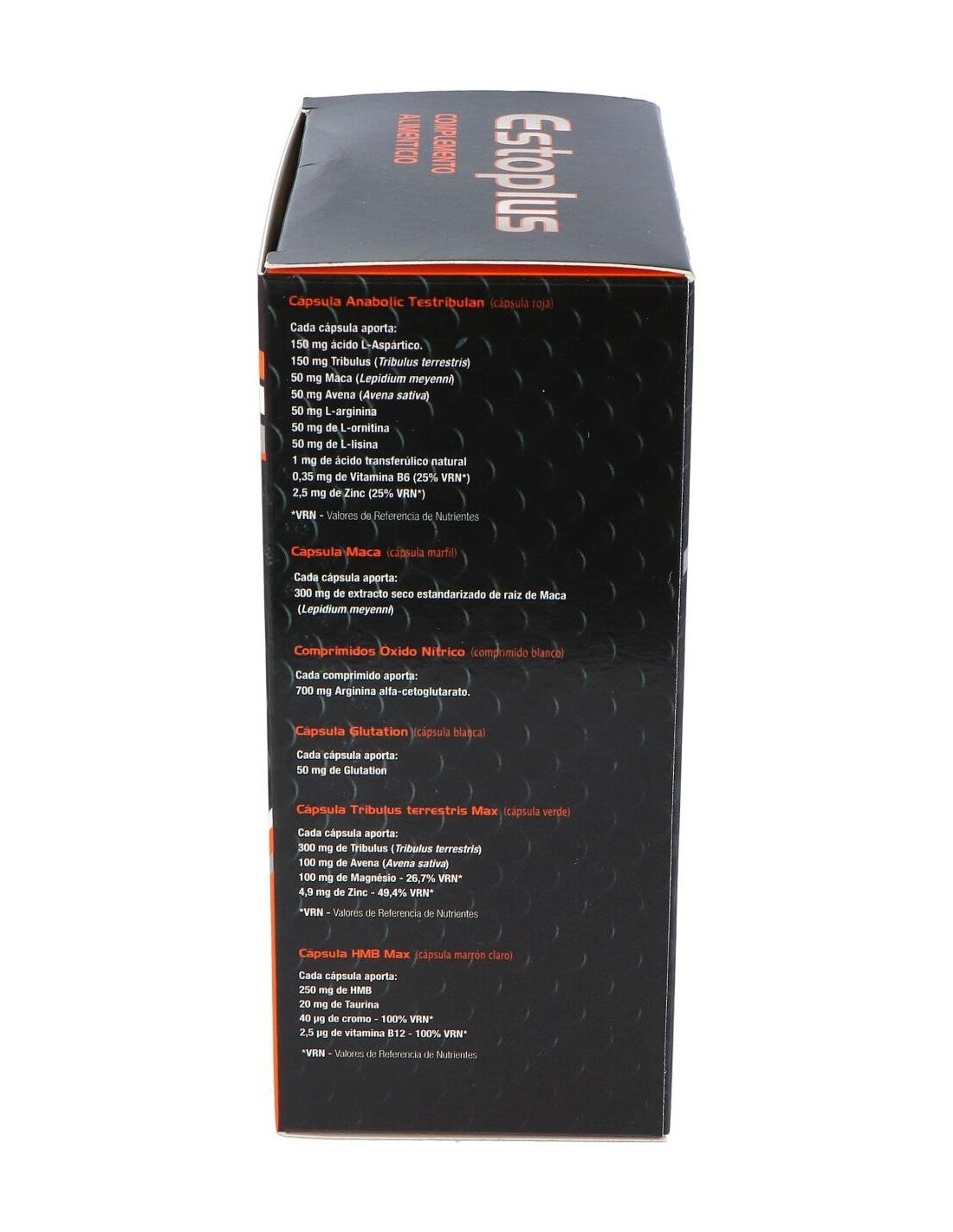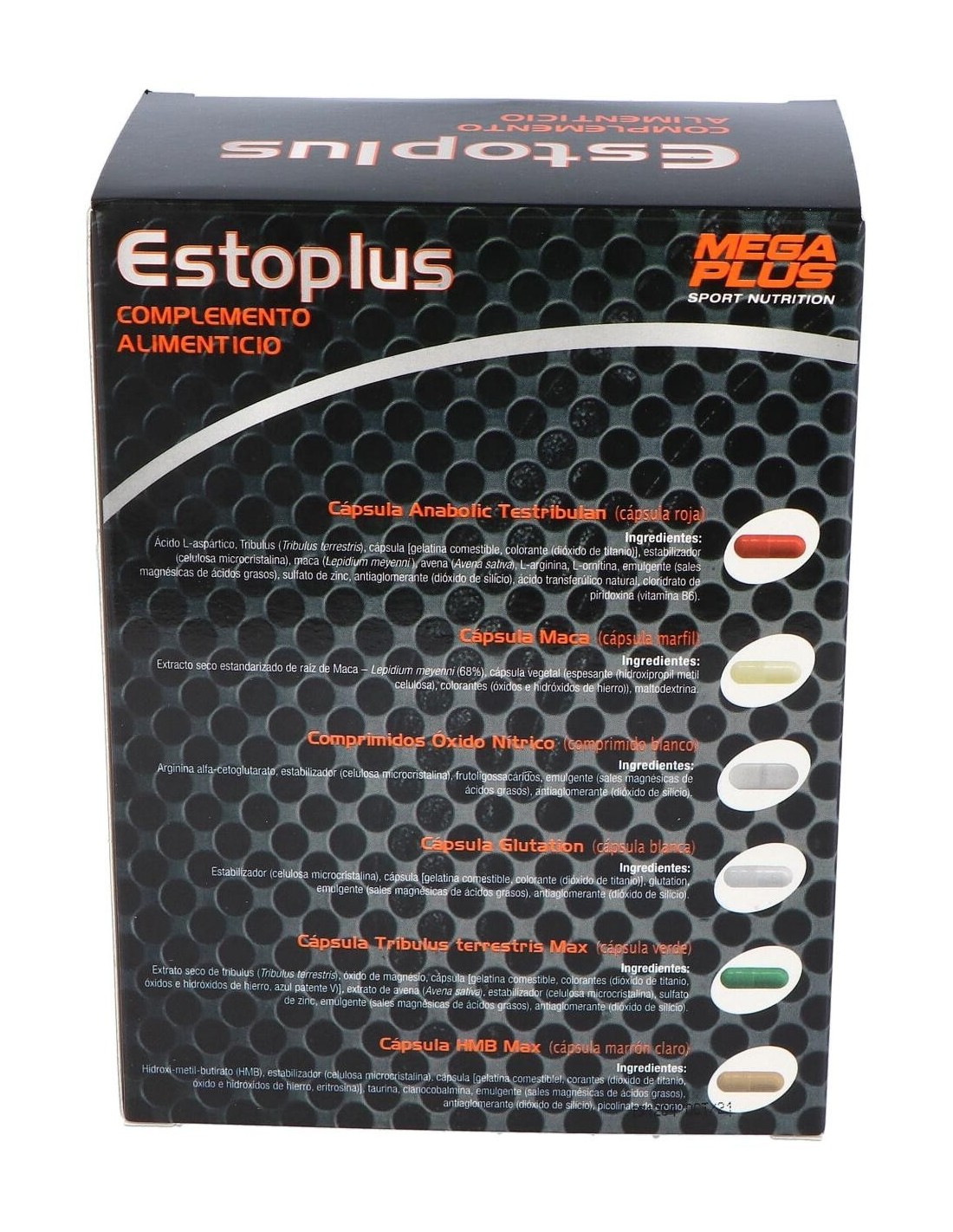 Cada pack contiene: 1 cápsula de Ácido Laspártico (color rojo), 1 cápsula de Maca (color marfil), 1 comprimido de Óxido nítrico, 1 cápsula de Glutation (color blanco), 1 cápsula de Tribulus Terrestris Max (color verde), 1 cápsula de HMB Max (color beig).