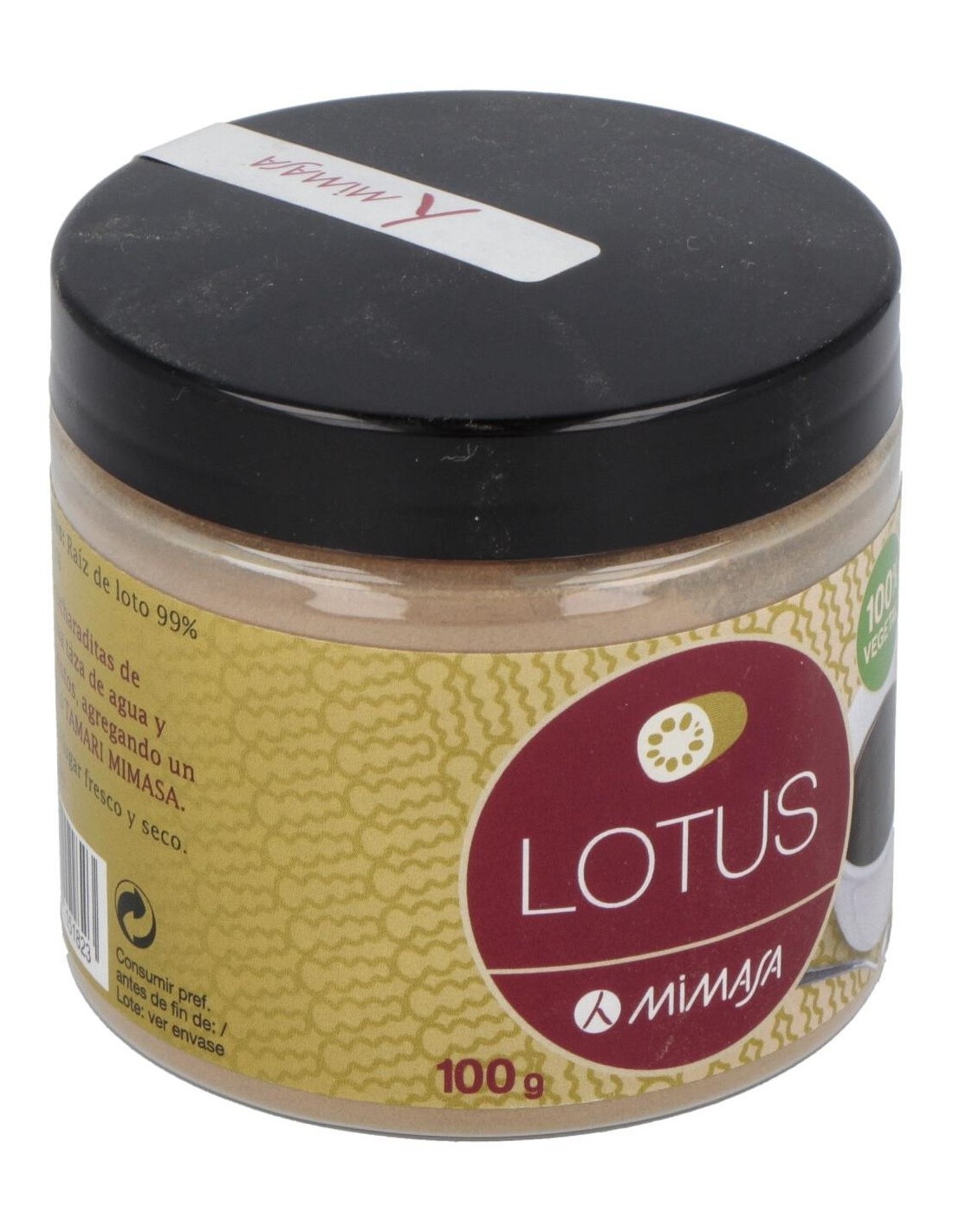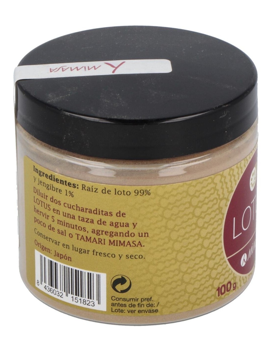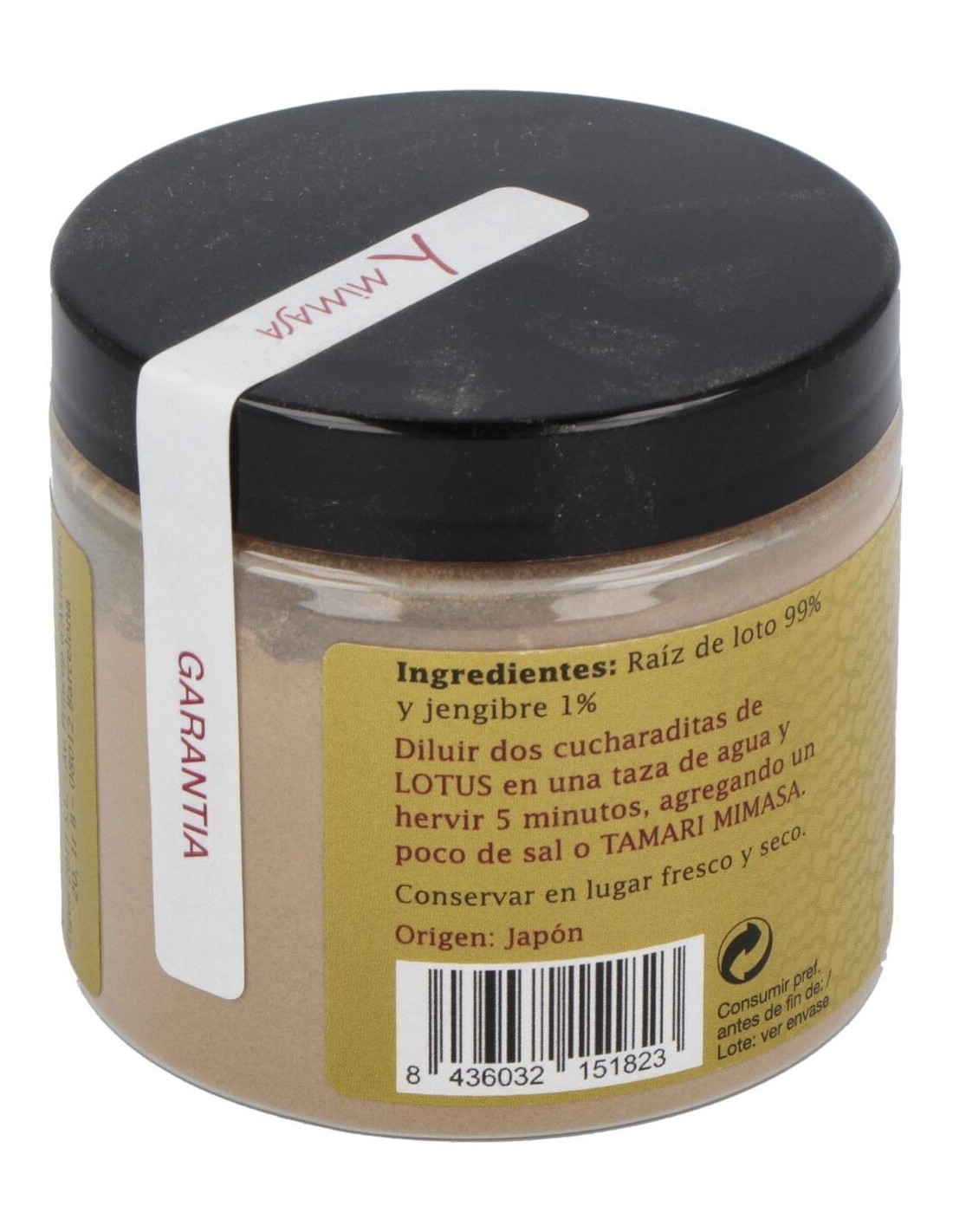 Es raíz de lotus de mimasa en polvo, un producto 100% biológico. Combinado con jengibre en poca cantidad. La raíz de esta planta es resistente y longeva. Con aporte medicinal contiene propiedades para favorecer el sistema cardiaco, la regulación arterias y mejorar la digestión en el cuerpo. Aporta energía. Ayuda a eliminar flemas y aliviar la tos. Apto para asmáticos. Uso diario. Puede utilizarse como infusión, o en emplasto mezclado con otros ingredientes para favorecer la eliminación de la mucosidad de los senos nasales.