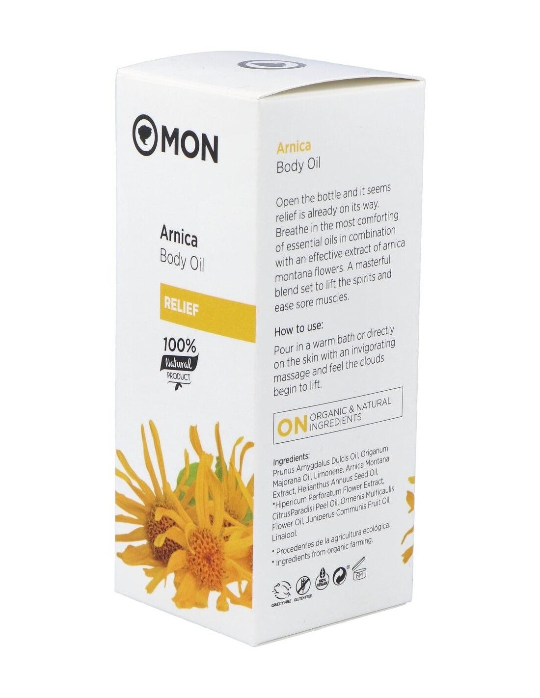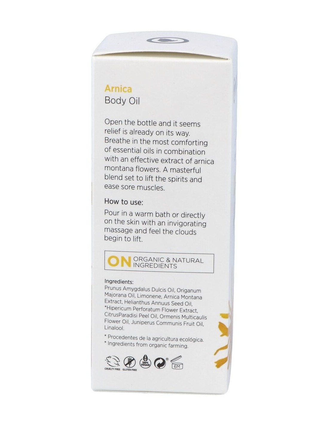 El extracto de árnica alivia las molestias musculares, los pequeños hematomas y contusiones, y es útil para ayudar a la recuperación muscular y articular tras la realización de ejercicio físico. También ejerce una función antiséptica sobre la piel.