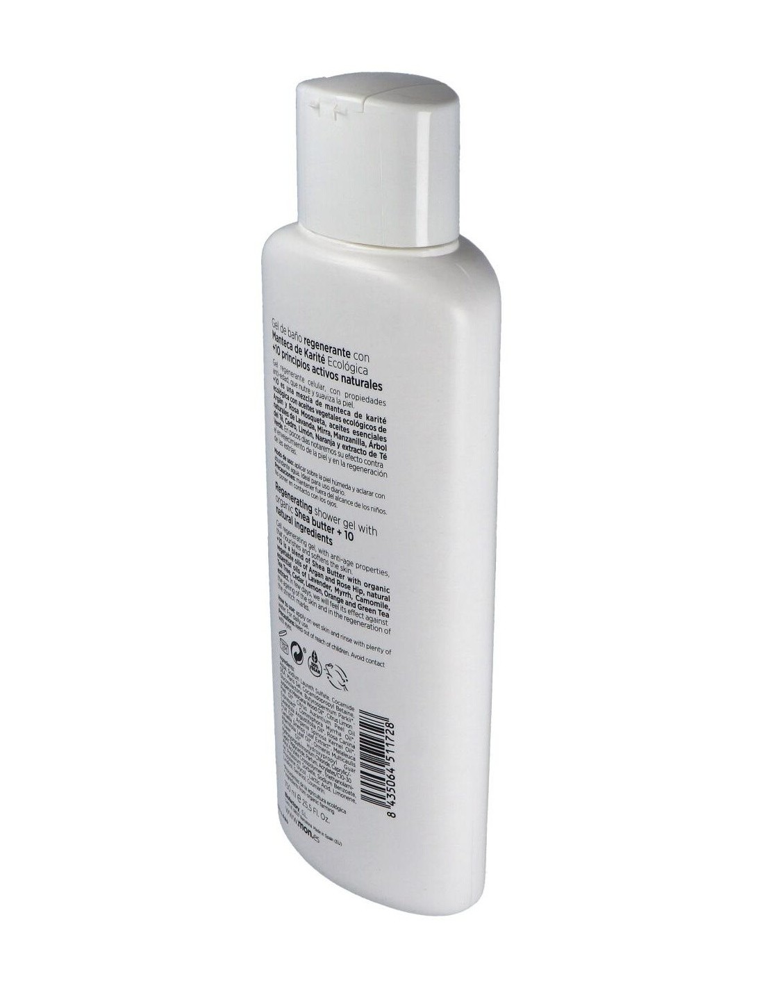 Gel de Ducha con Karité +10 ecológico de Mon Deconatur, formulado con manteca de Karité, aceite vegetal de argán y rosa mosqueta. La sinergia de estos componentes resulta en una rica fuente de nutrientes que favorecen la recuperación y regeneración cutánea. Además, facilita propiedades anti-edad que nutre y suaviza la piel. En pocos los resultados sobre la piel se aprecian: Efecto regenerador contra el envejecimiento y las estrías.