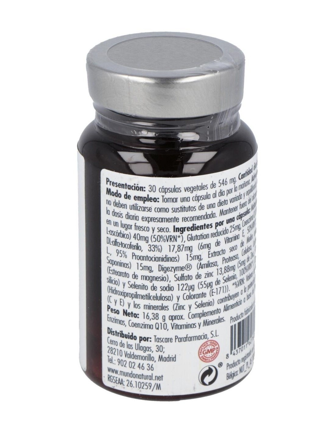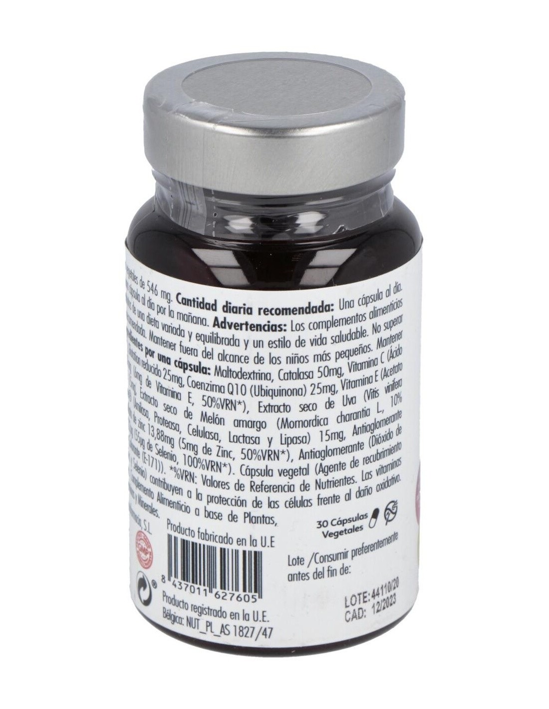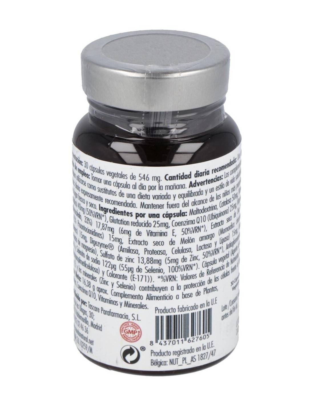 Selenito De Sodio (122 µg), Catalasa (50 mg), Vitamina C (40 mg), Coenzima Q10 (25 mg), Glutation Reducido (25 mg), Vitamina E (17.87 mg), DigeZyme (15 mg), Extracto seco de Uvas (15 mg), Extracto seco de Melón amargo (15 mg), Sulfato de Zinc (13.88 mg), Maltodextrina, Estearato de magnesio, Hidroxipropilmetilcelulosa.