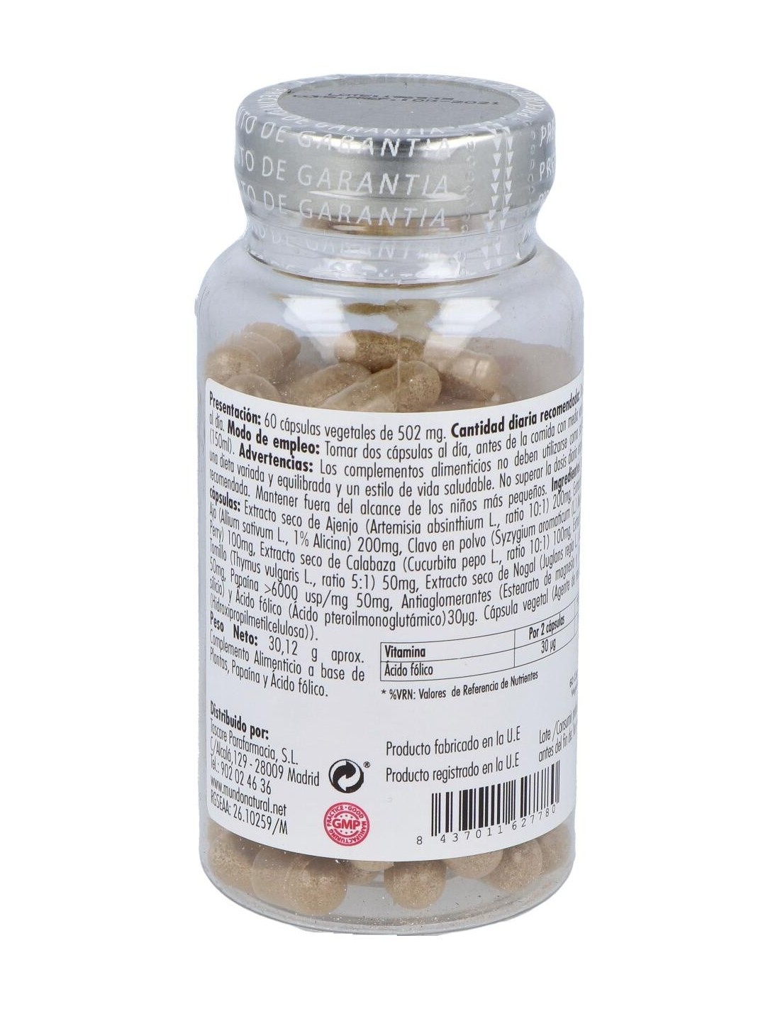 Complemento alimenticio con fórmula 100% natural a base de activos botánicos, papaína y ácido fólico. Elaborado con extractos de ajenjo, nogal, ajo, clavo, calabaza y tomillo. Recomendado para el tratamiento de anemias megaloblásticas de origen nutricional, debido a una deficiencia de ácido fólico. Contribuye a mejorar las funciones digestivas e inmunes. El ajenjo es muy conocido y se utiliza como repelente de parásitos. El nogal es fuente de vitaminas B1, B2, B6 y ácido fólico que actúa como alimento para los nervios. Estas vitaminas del grupo B mantienen importantes funciones cerebrales y favorecen la capacidad de concentración.