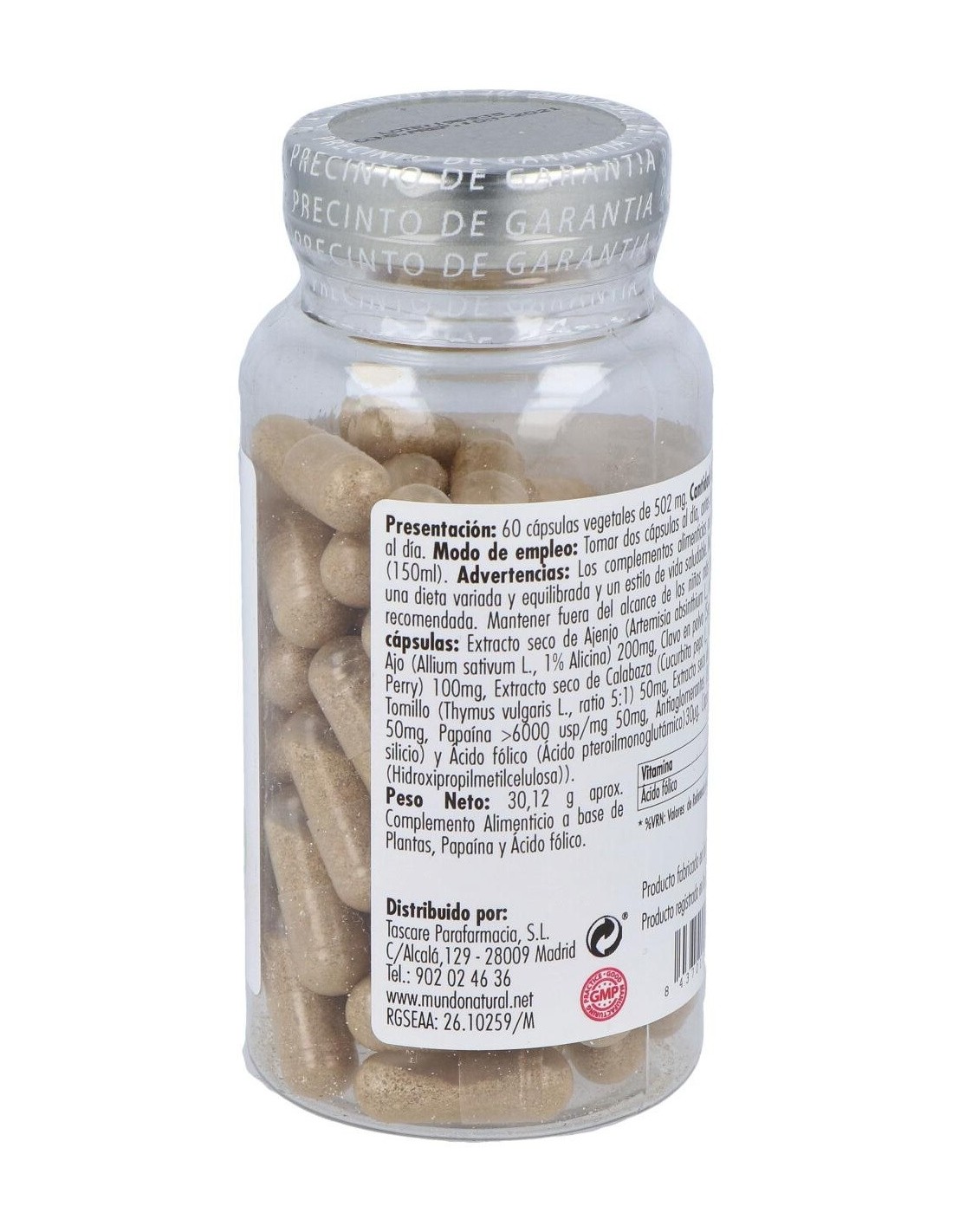 Ingredientes por dos cápsulas: Extracto seco de Ajenjo (Artemisia absinthium L., ratio 10:1) 200mg, Extracto seco de Ajo (Allium sativum L., 1% Alicina) 200mg, Clavo en polvo (Syzygium aromaticum (L.) Merr. et L.M. Perry) 100mg, Extracto seco de Calabaza (Cucurbita pepo L., ratio 10:1) 100mg, Extracto seco de Tomillo (Thymus vulgaris L., ratio 5:1) 50mg, Extracto seco de Nogal (Juglans regia L., ratio 10:1) 50mg, Papaína >6000 usp/mg 50mg, Antiaglomerantes (Estearato de magnesio y Dióxido de silicio) y Ácido fólico (Ácido pteroilmonoglutámico) 30µg (15% *VRN). Cápsula vegetal (Agente de recubrimiento (Hidroxipropilmetilcelulosa) y Colorante (Concentrado de espirulina)).