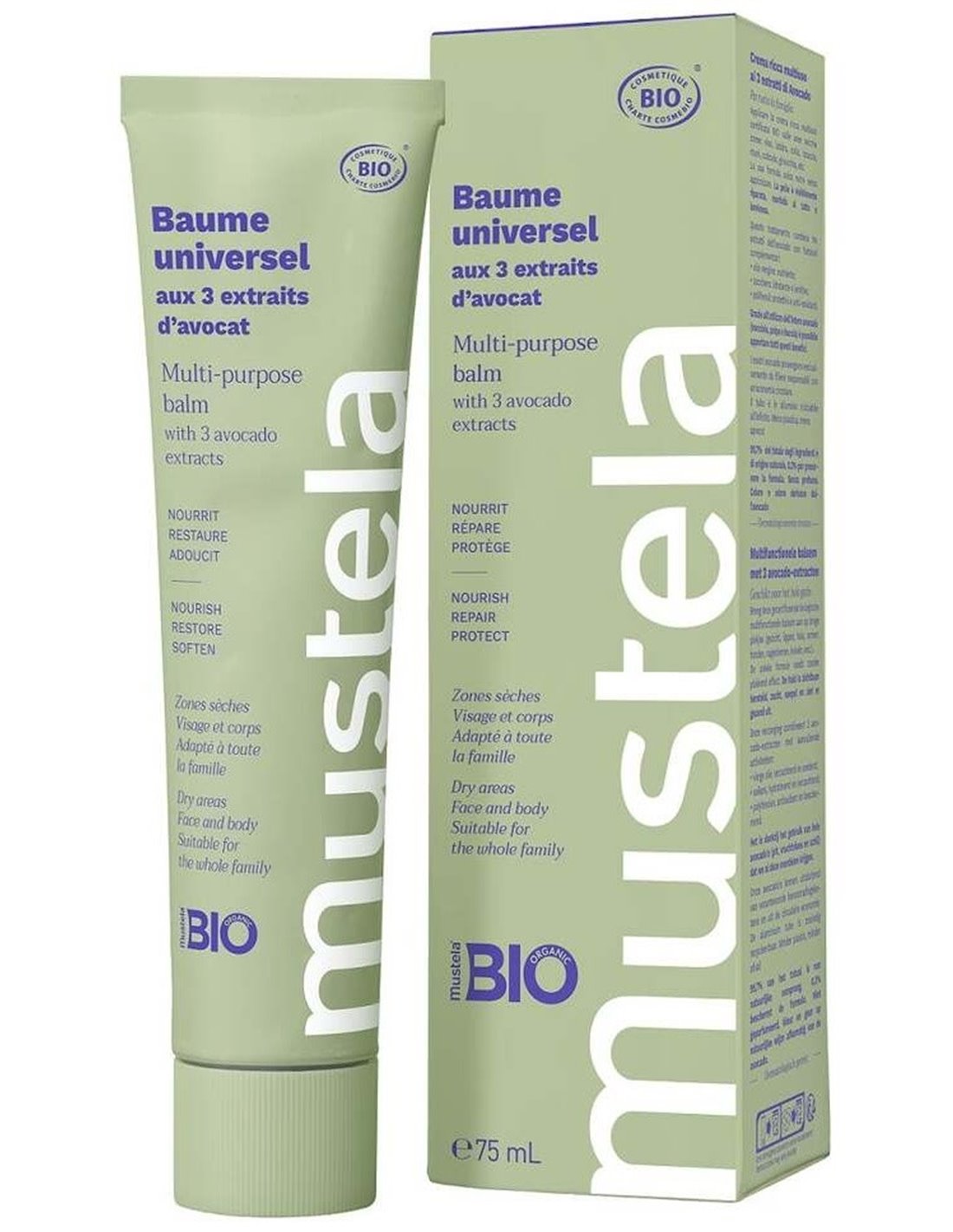 MUSTELACon 3 Extractos de Aguacate nutre, repara y protege todas las zonas secas (cara, labios, manos, pies, codos, etc.). Su color y su olor únicos son los que aporta de forma natural el aguacate. Sin perfume, fórmula vegana. Puede utilizarse desde el nacimiento y es para toda la familia.