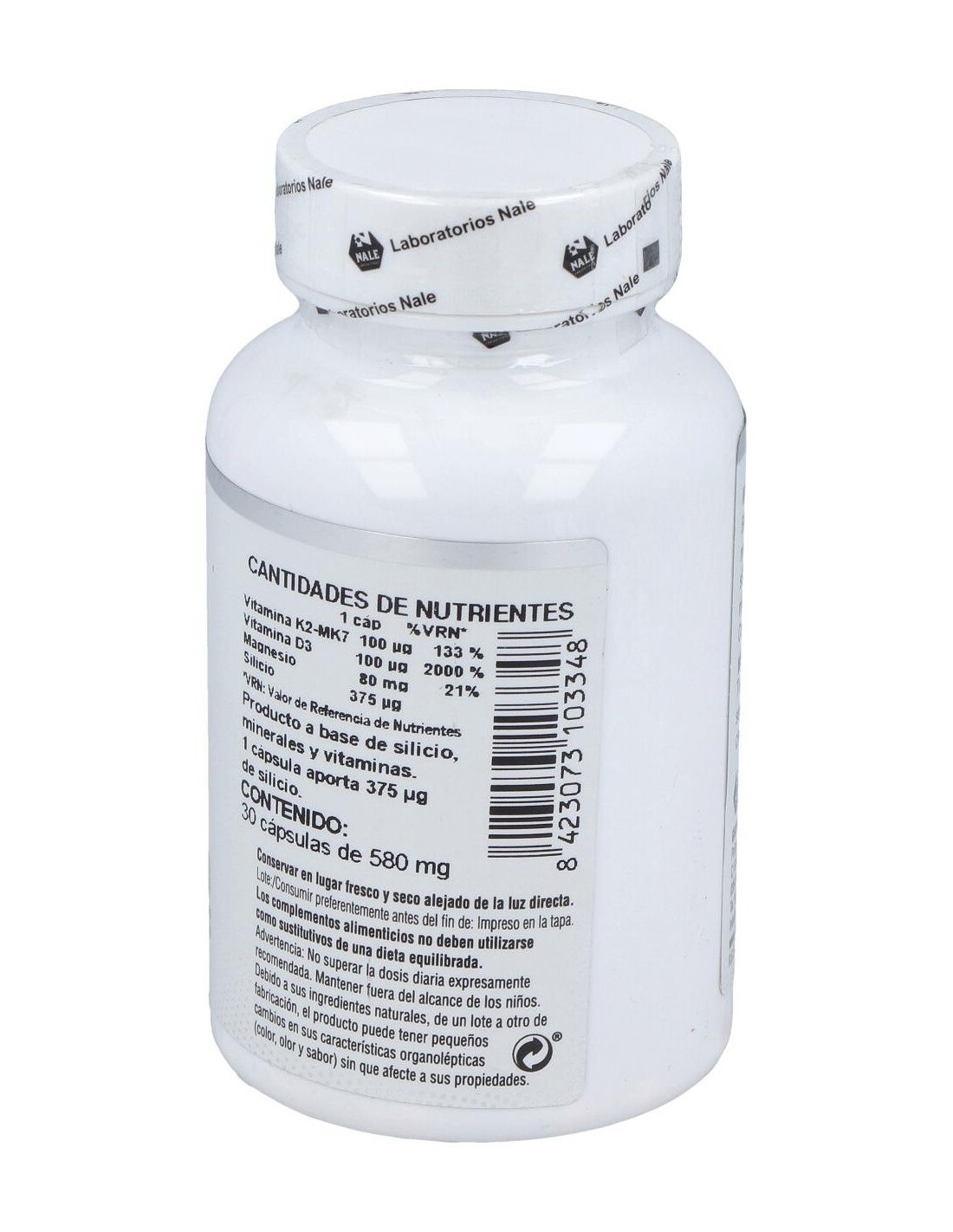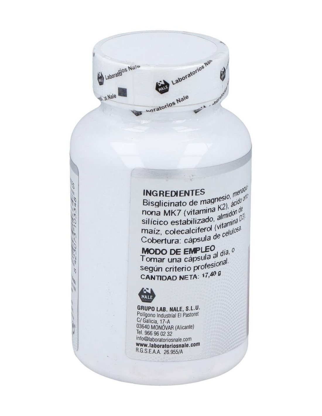 Bisglicinato de magnesio 400 mg, ácido ortosilícico estabilizado 25 mg, almidón de maíz, menaquinona 7 (vitamina K2) 50 mg y colecalciferol (vitamina D3) 20 µg. Cobertura: cápsula de celulosa.