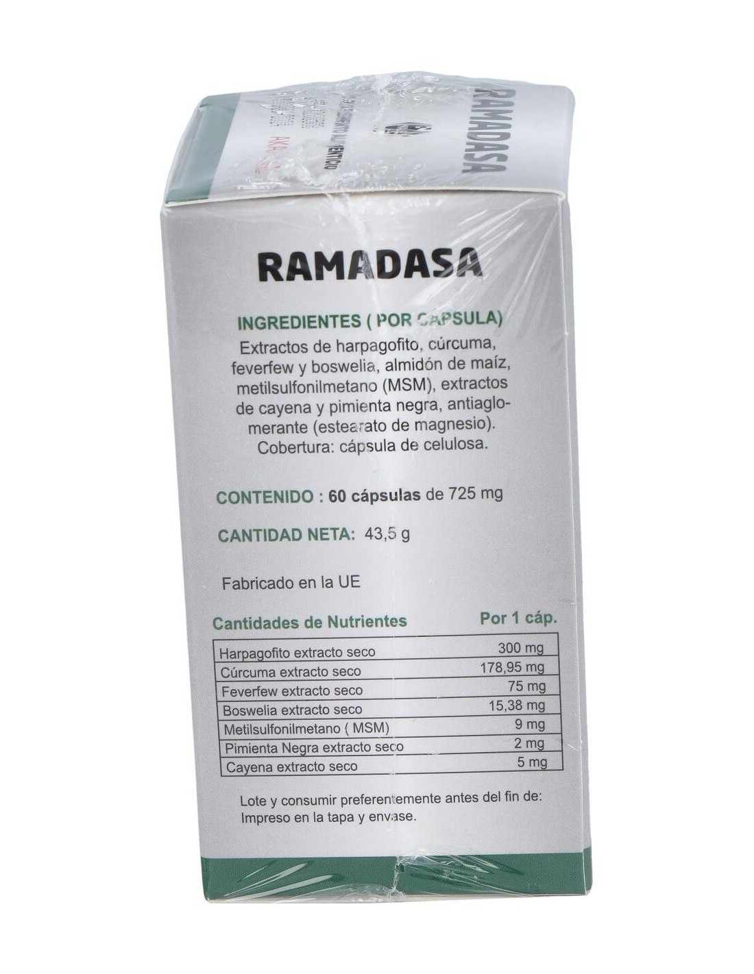 Extractos de harpagofito, cúrcuma, feverfew y boswelia, almidón de maíz, metilsulfonilmetano (MSM), extractos de cayena y pimienta negra, antiaglomerante (estearato de magnesio). Cobertura: cápsula de celulosa.