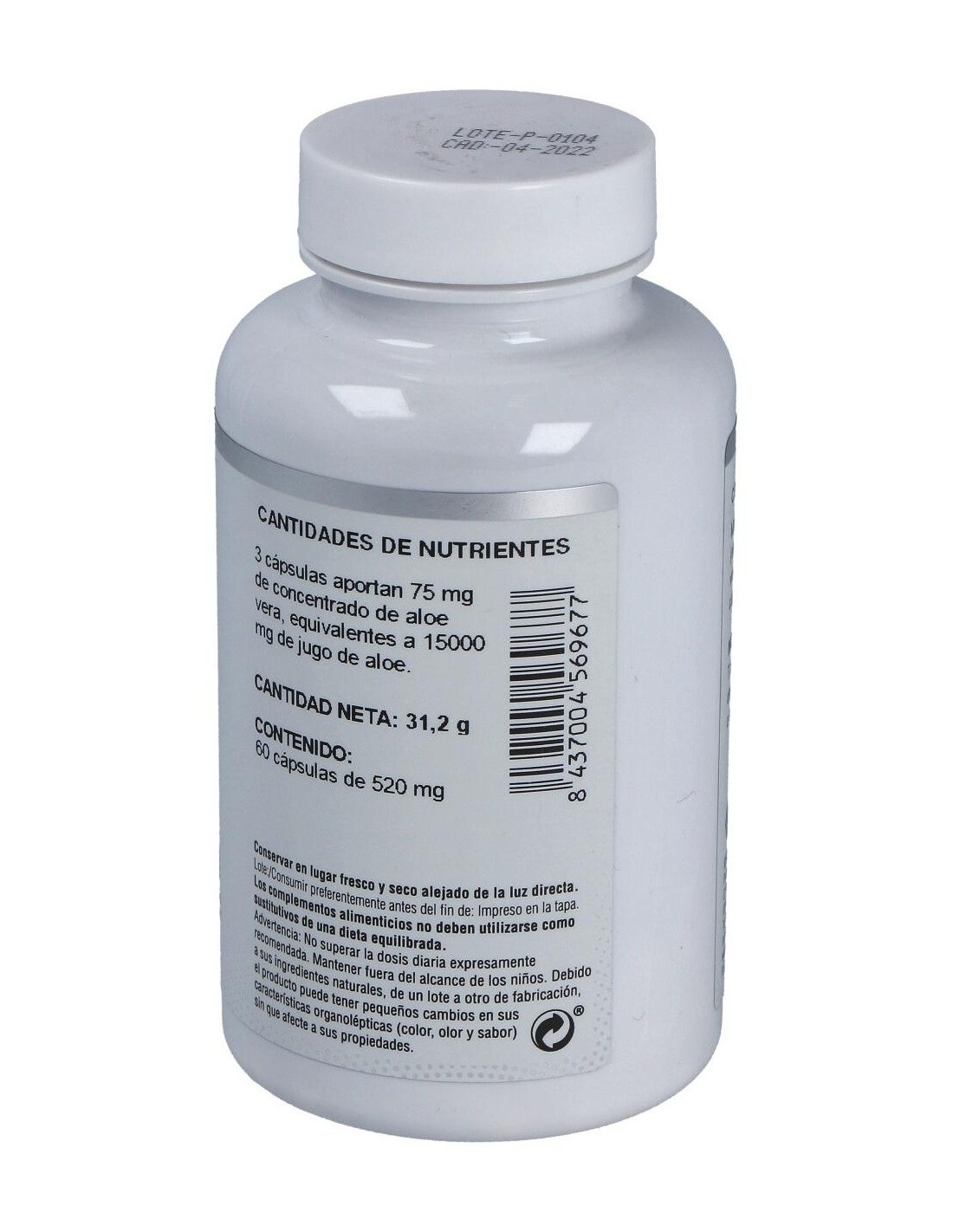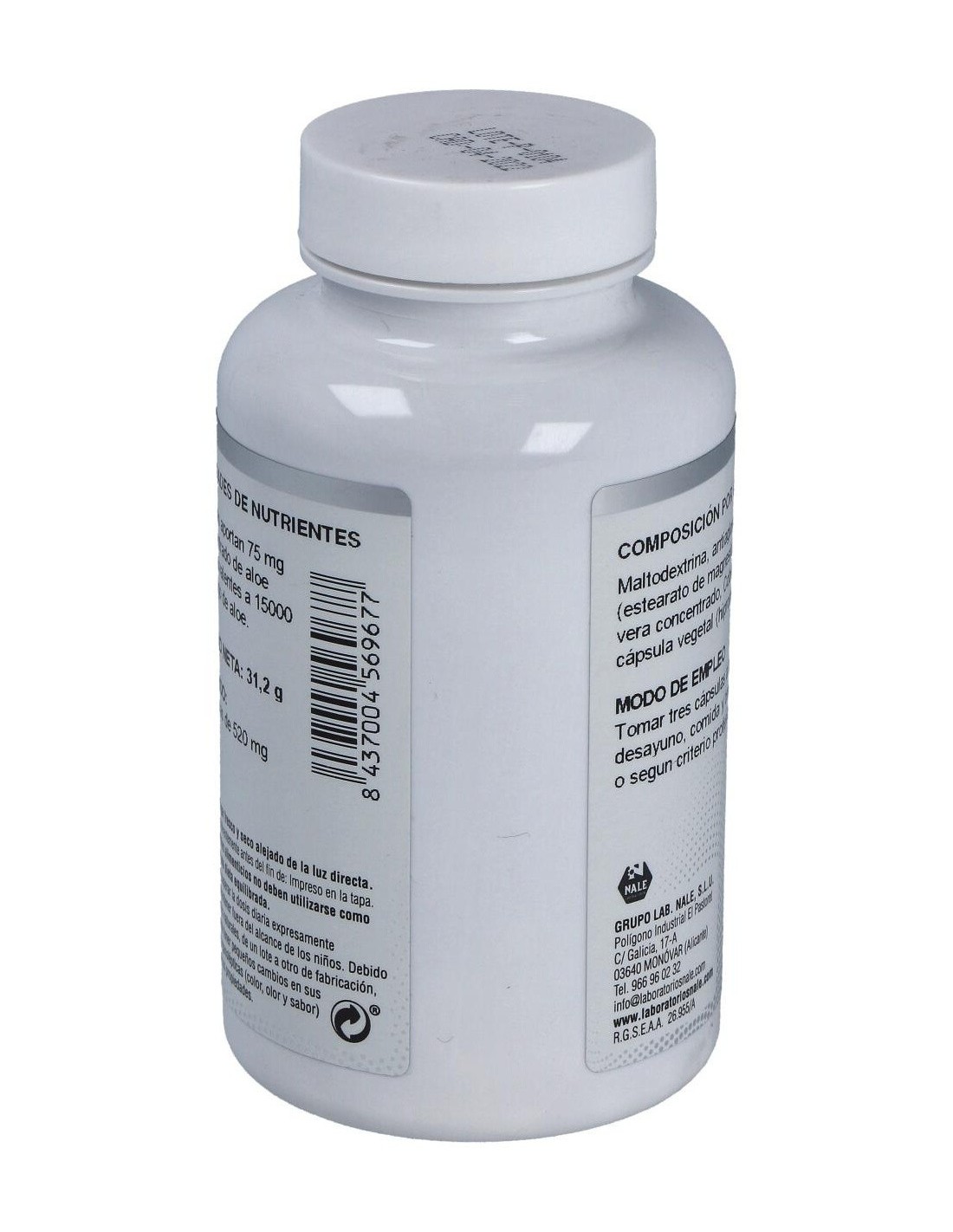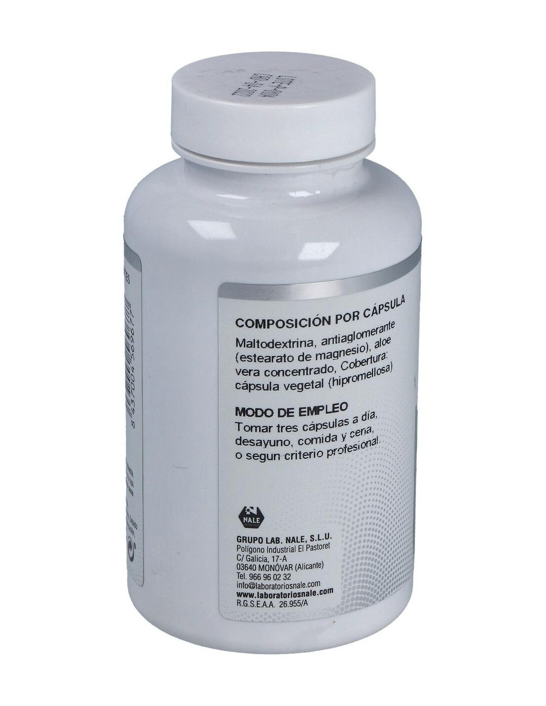 Aloe Vera Concentrado 25 mg/cápsula, equivalente a 5000 mg de jugo de aloe. Antiaglomerante (Estearato de Magnesio). Cápsula Vegetal (Hipromellosa).