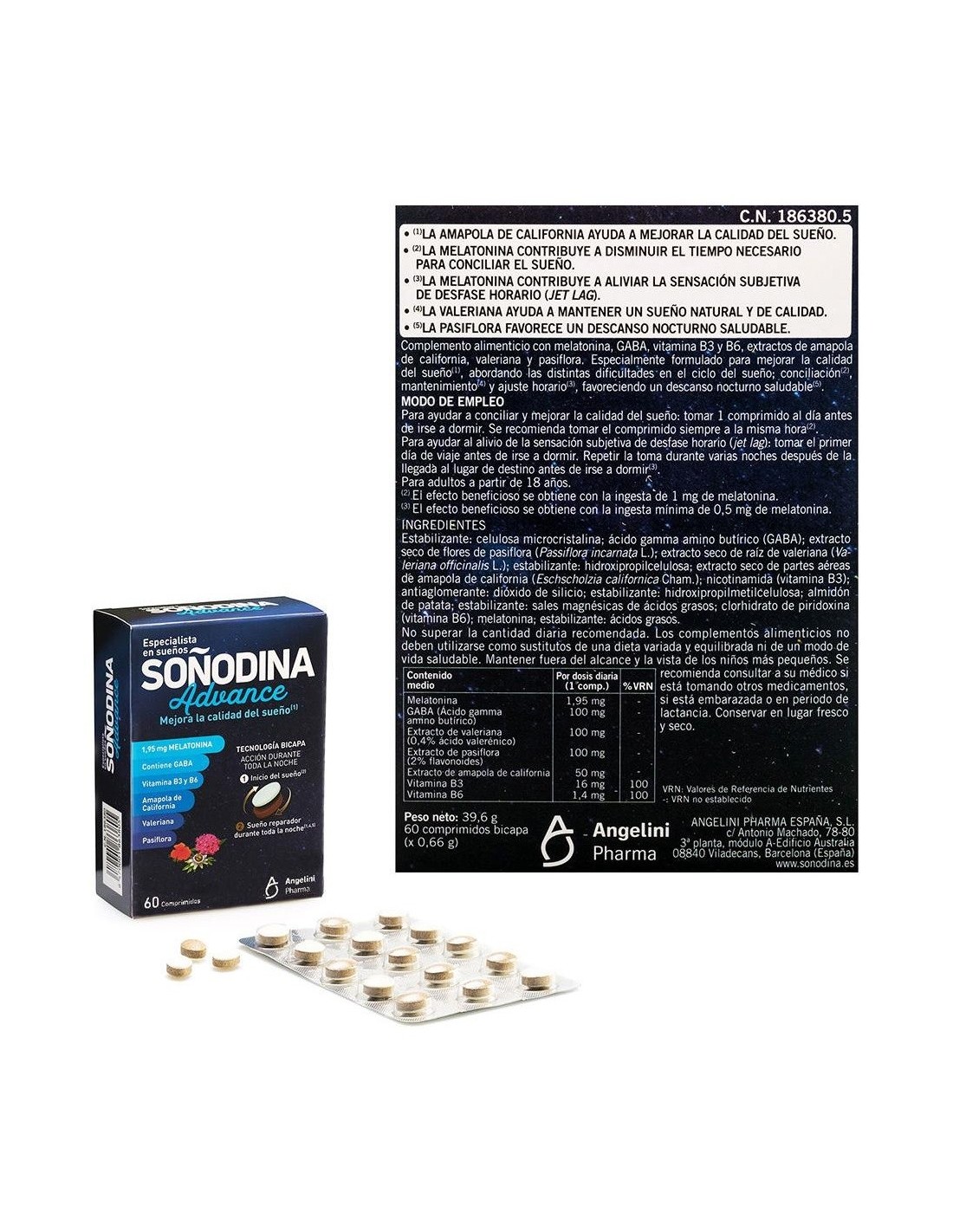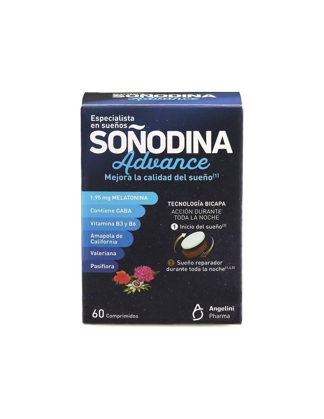 NATURA ESSENZIALEGracias a su innovadora tecnología en comprimido bicapa, permite una acción durante toda la noche: primero se libera la capa de Melatonina, que ayuda a conciliar el sueño y después la capa de los extractos vegetales, que ayudan a mantener un sueño de calidad (valeriana) y un descanso saludable (pasiflora). Indicado en adultos a partir de 18 años.