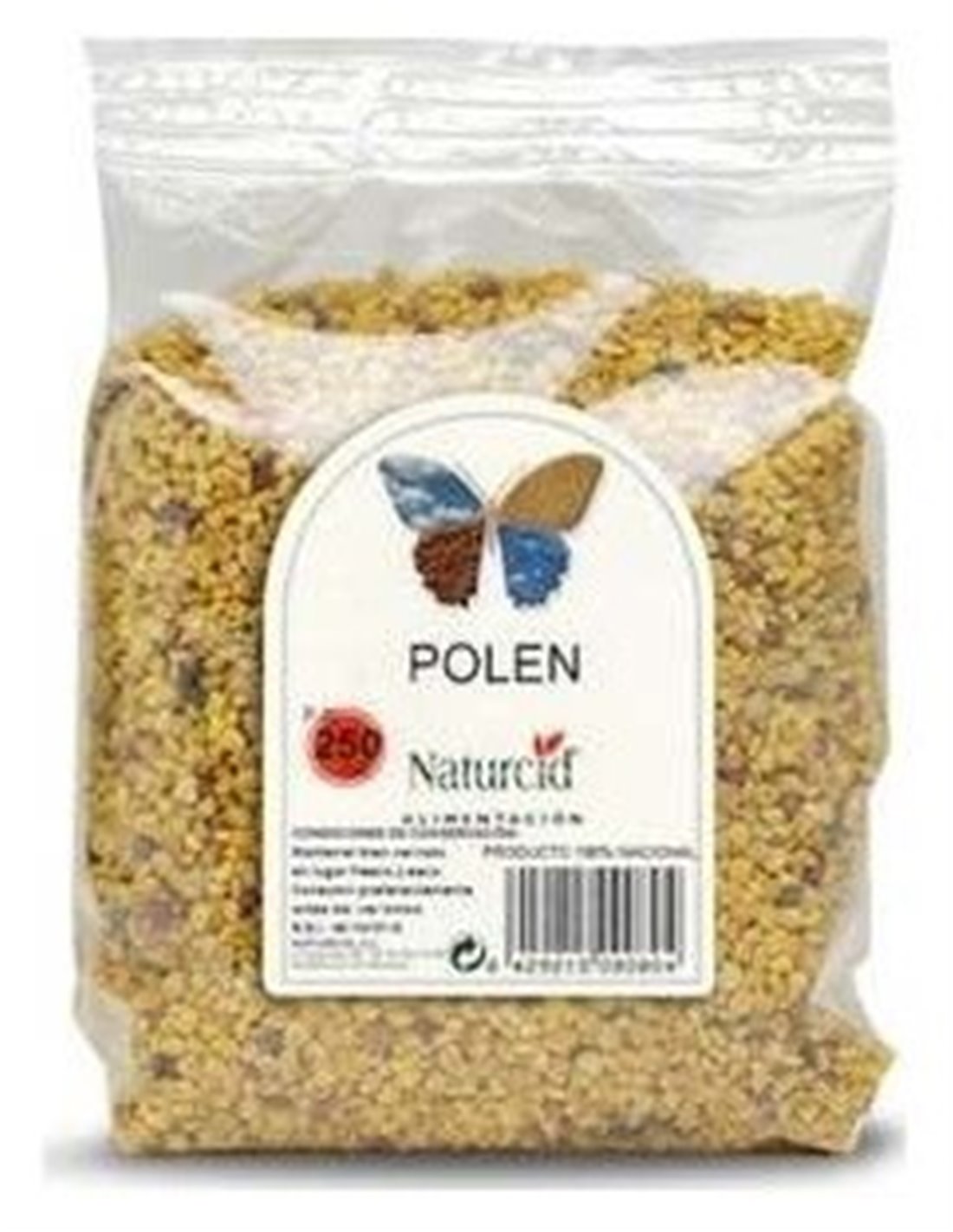 Polen de abejas multicolor, 100% origen España.\ \ Valor nutricional por 100 g:\ Energía 1.488 kJ 356 kcal\ Grasas 7,20 g\ De las cuales saturadas 2,15 g\ Carbohidratos 55,30 g\ De los cuales azúcares 39,40 g\ Proteínas 20 g\ Sal 0 g