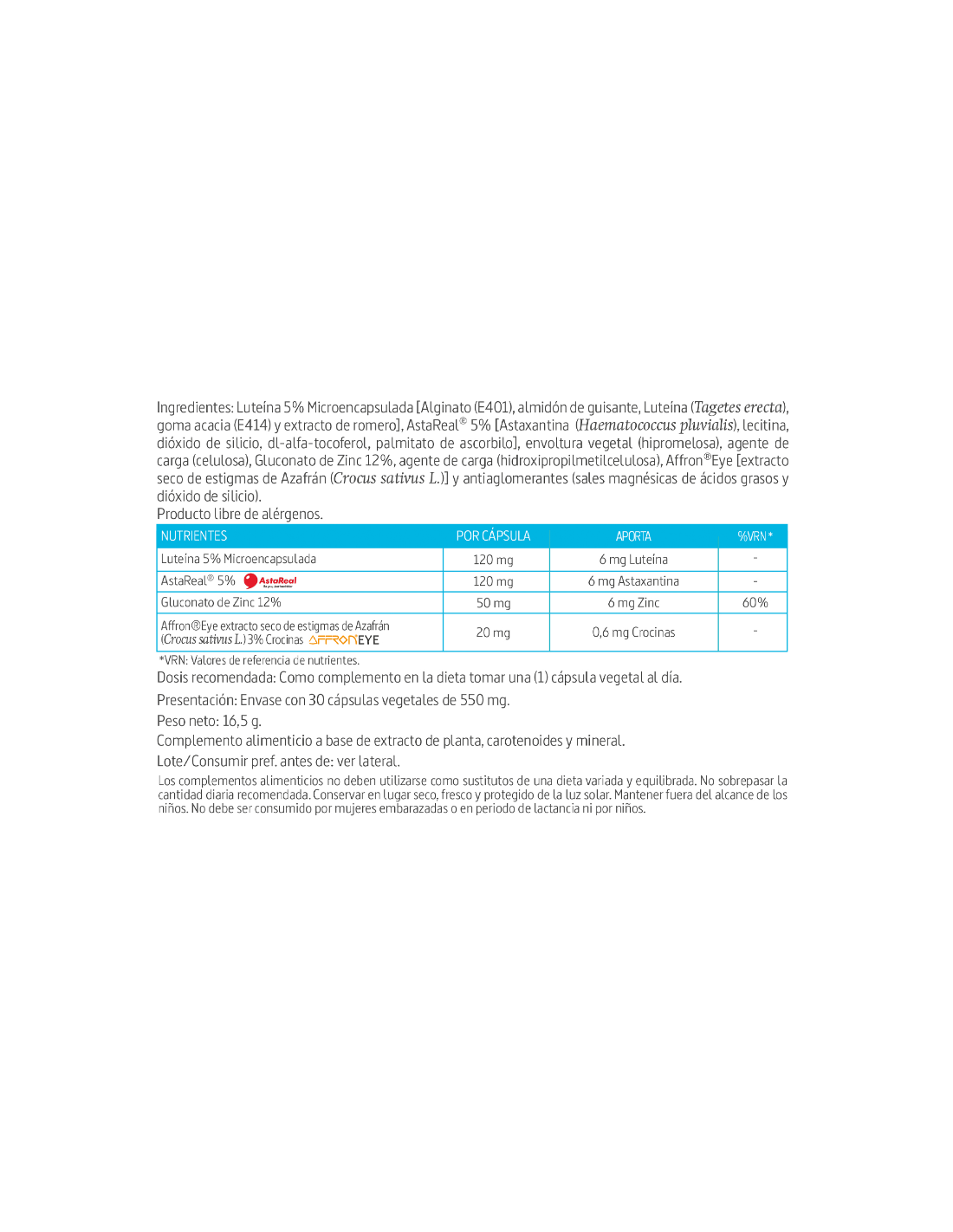 Complemento alimenticio a base de luteína, astaxantina, zinc y azafrán.