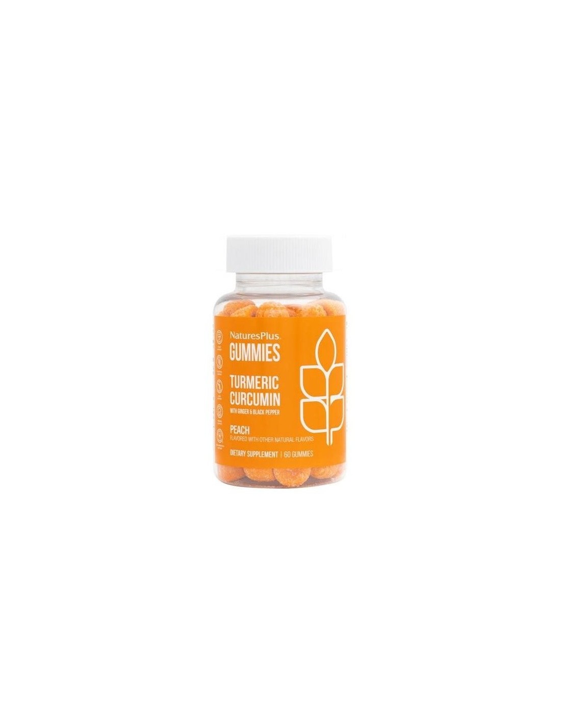 NATURES PLUSComplemento alimenticio de cúrcuma con jengibre y pimienta negra, para una correcta absorción y máxima actividad, en forma de gominolas. El extracto de cúrcuma valorado en curcumina apoya el normal mantenimiento de músculos y articulaciones, así como la digestión y la normal función hepática. Este formato es ideal para niños, personas con dificultades para tragar comprimidos y polimedicados. Producto vegetariano y sin gluten. Sabor a melocotón.