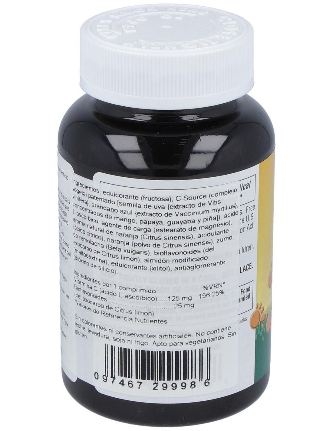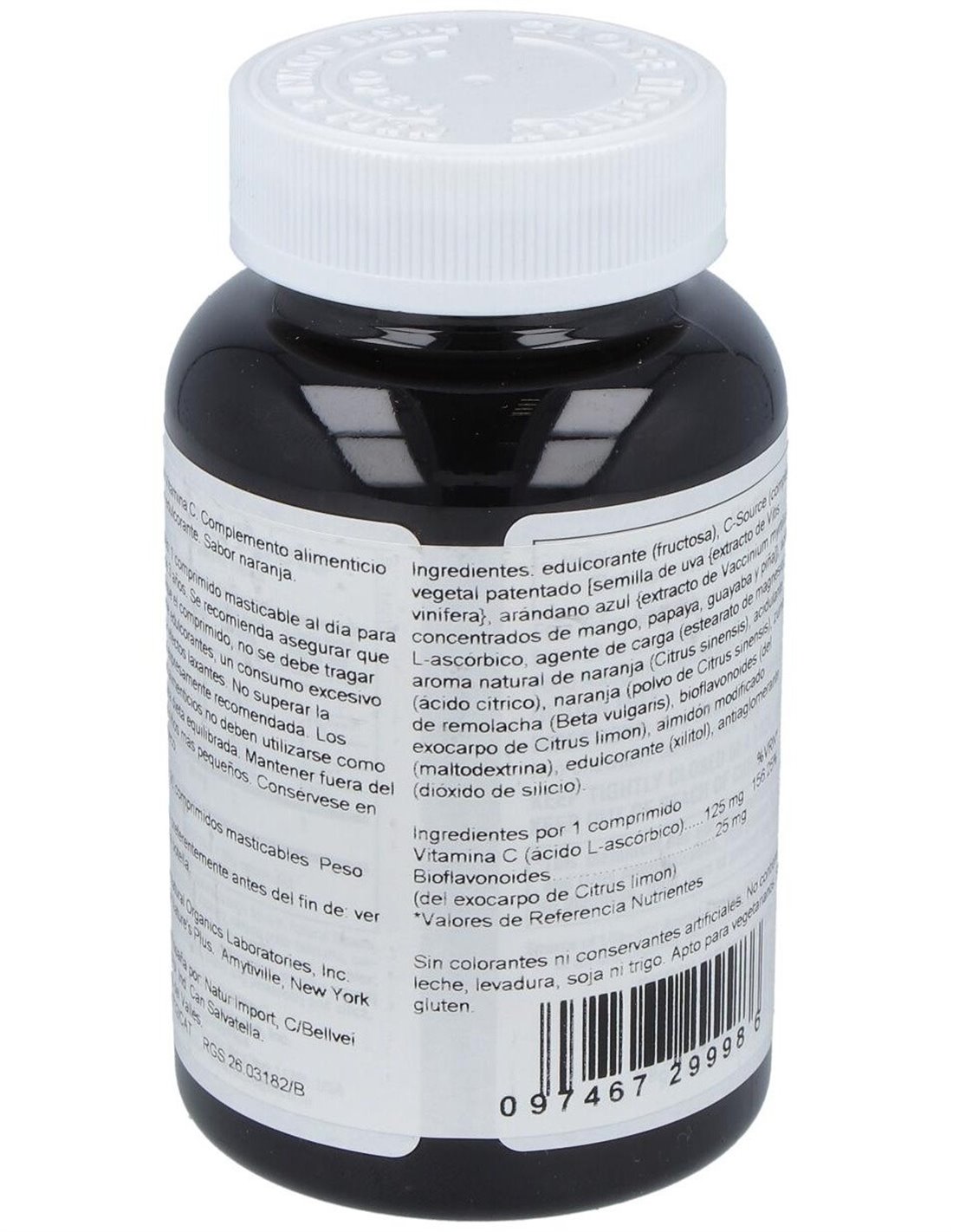 300 mg de C-Source (complejo vegetal: semilla de uva , arándanos y concentrado de mango, papaya, guayaba y piña). 125 mg de vitamina C (ácido L-ascórbico). 25 mg de bioflavonoides (del exocarpo de Citrus limon).