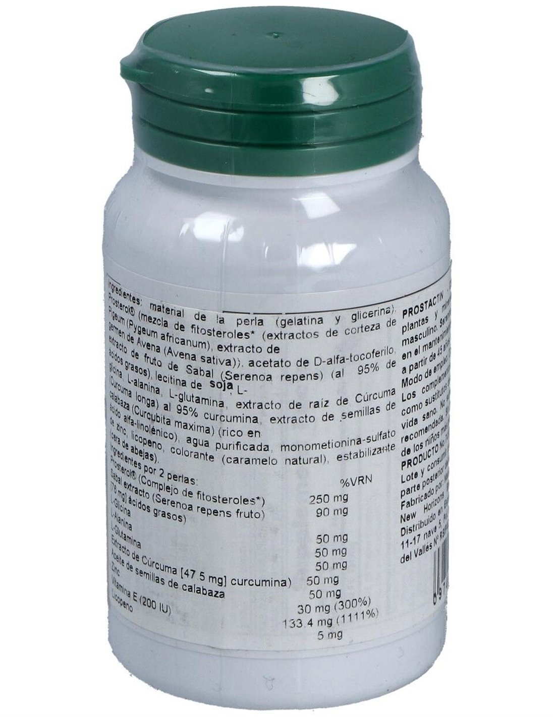 Material de la perla (gelatina y glicerina), Prosterol® (mezcla de fitosteroles (extractos de corteza de Pigeum (Prunus africanum), extracto de germen de Avena (Avena sativa)), acetato de D-alfa-tocoferilo, extracto de fruto de Sabal (Serenoa repens) (valorado en 95% de ácidos grasos), lecitina de soja, L-glicina, L-alanina, L-glutamina, extracto de raíz de Cúrcuma (Curcuma longa), extracto de semillas de Calabaza (Curcubita maxima), agua purificada, mono Lmetionina- sulfato de cinc, licopeno, colorante (caramelo simple), cera de abejas.