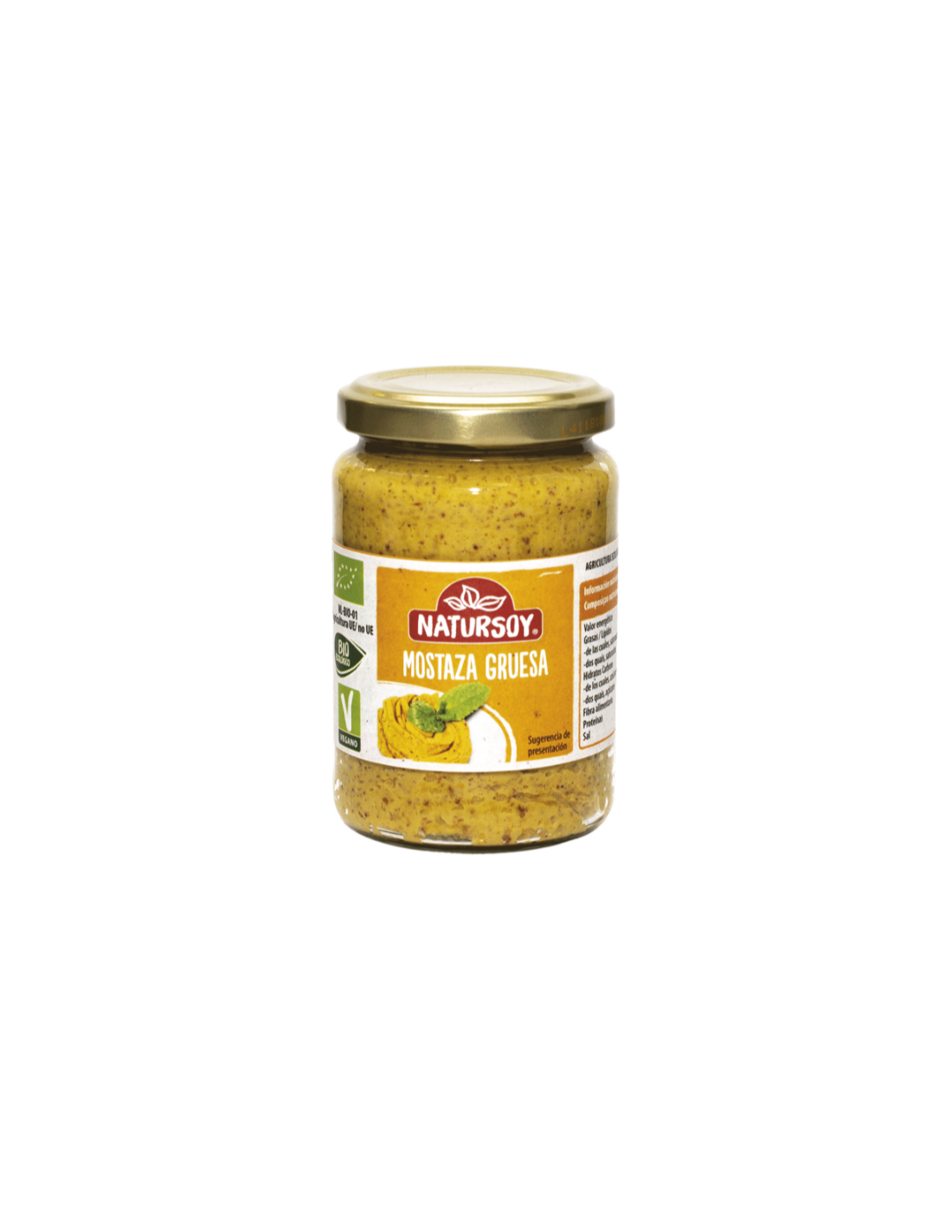 NATURSOYMolho grosso de mostarda, de agricultura biológica. Ideal para temperar sanduíches, legumes e pratos principais. Certificado BIO e Vegan. Mostarda tem propriedades anti-sépticas e digestivas. Modo de emprego Ideal para qualquer receita e para temperar alimentos. Ingredientes Sementes de MOSTARDA amarela*, vinagre*, sementes de MOSTARDA castanha*, água, sal marinho, xarope de agave*, ácido láctico, açafrão*, sementes de coentros*, funcho*.
