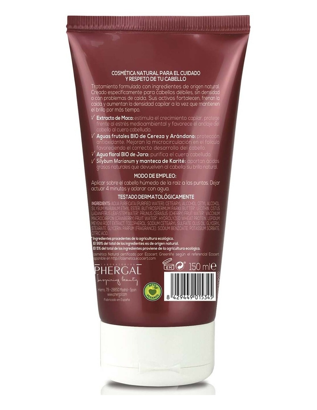Aqua Purificata (Purified Water), Cetearyl Alcohol, Cetyl Alcohol, Silybum Marianum Ethyl Ester, Butyrospermum Parkii Butter*, Lecithin, Cistus Ladaniferus Leaf/Stem Water*, Prunus Cerasus (Cherry) Fruit Water*, Vaccinium Macrocarpon (Cranberry) Fruit Water*, Hydrolyzed Wheat Protein, Lepidium Meyenii Root Extract, Tocopherol, Sodium Cetearyl Sulfate, Olus Oil, Glyceryl Stearate, Glycerin, Parfum (Fragrance), Sodium Benzoate, Potassium Sorbate, Citric Acid. (*) Ingredientes procedentes de la agricultura ecológica.