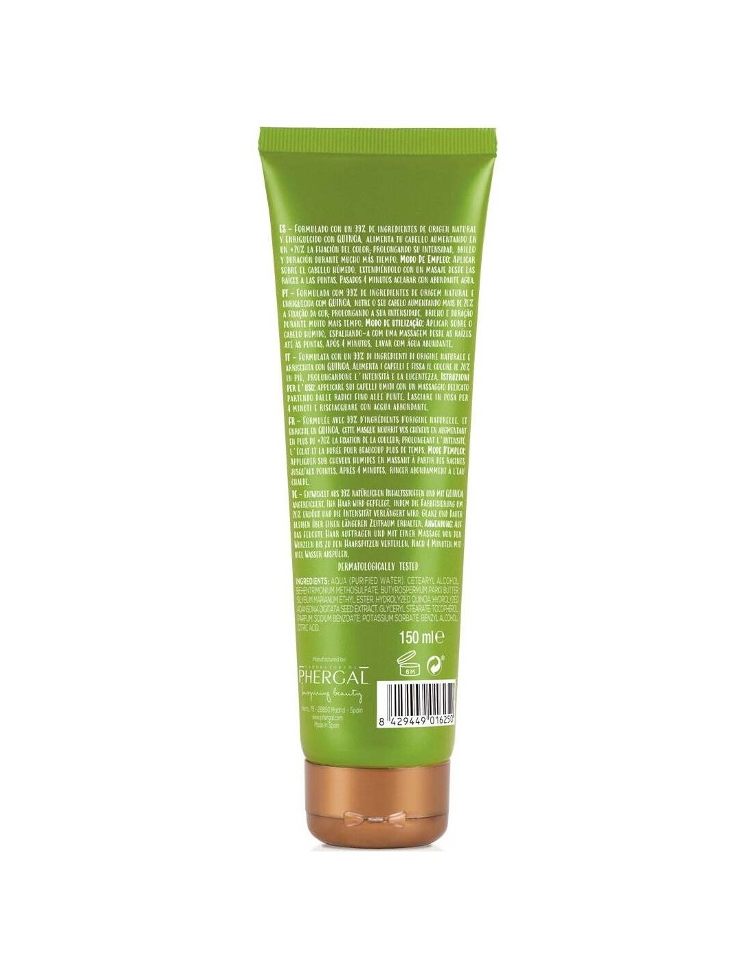 Mascarilla formulada con Quinoa, superalimento rico en vitaminas y minerales, además de aportar los ocho aminoácidos esenciales. Repara, nutre y prolonga la intensidad y duración del color en cabellos teñidos. Enriquecido con Manteca de Karité, Proteínas de Baobab y Cardo Mariano, para un cabello intensamente nutrido, suave y lleno de brillo.