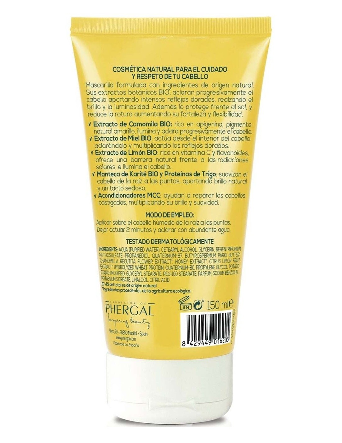 Mascarilla capilar diseñada para el cuidado y nutrición en todo tipo de cabellos. Formulada con extracto de manzanilla ecológica, rico en apigenina, pigmento natural amarillo, ilumina y aclara progresivamente el cabello. Contiene limón, rico en vitamina C y flavonoides, ayuda a proteger y favorece la barrera natural capilar frente a las radiaciones solares, contribuye a iluminar el cabello. Enriquecida con miel, manteca de karité y proteínas de trigo que ayudan a hidratar el cabello de la raíz a las puntas. Con acondicionadores MCC, favorecen la reparación brillo y luminosidad. Apto para todo tipo de cabellos. Con el 98% de ingredientes de origen natural-.