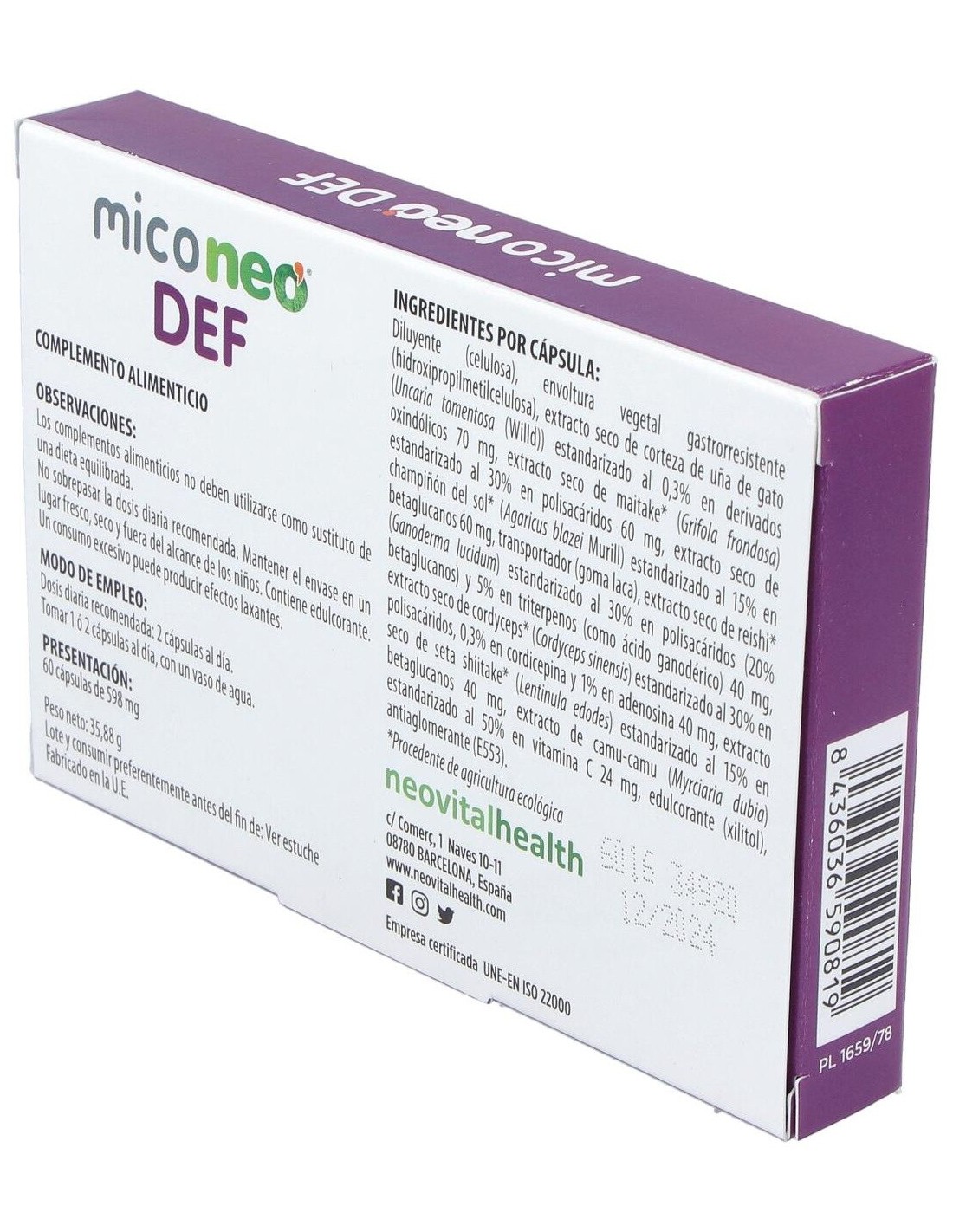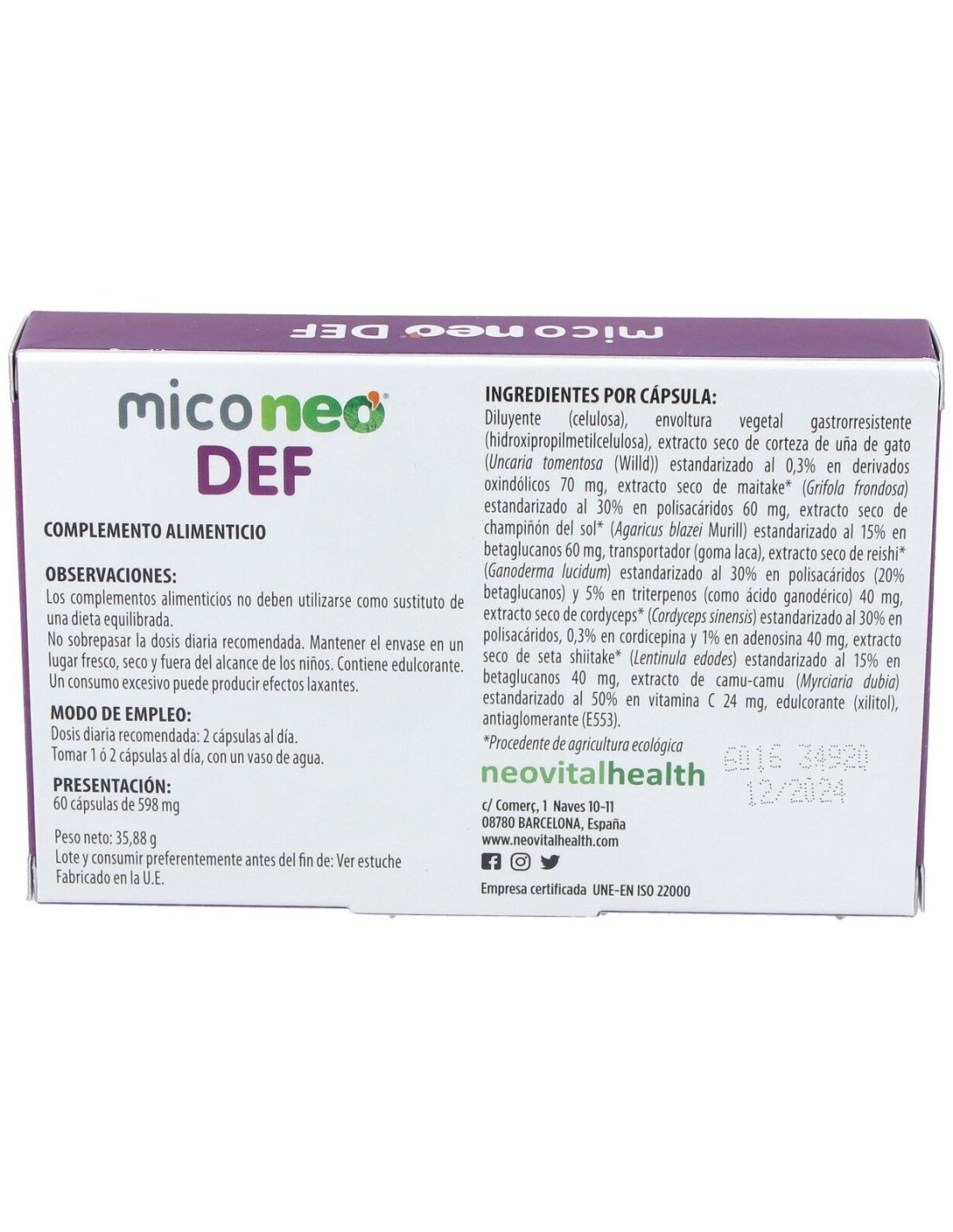 Propiedades del Mico Neo Def de Neovital Health: