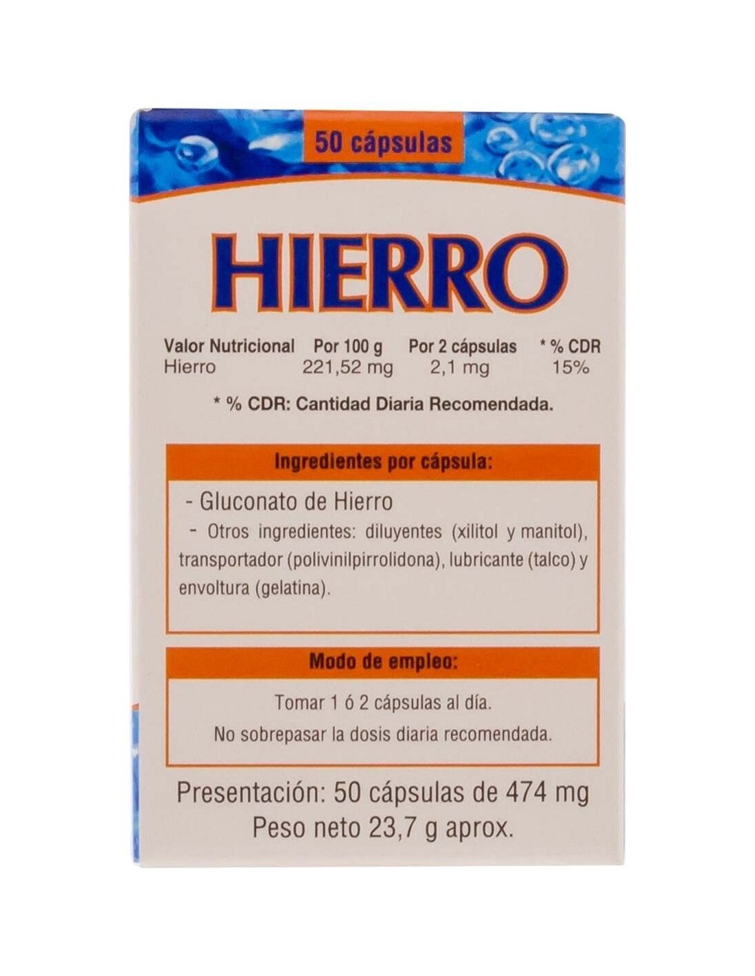 Complemento alimenticio elaborado para tratamientos de casos de anemia y debilidad en la sangre. Es un producto con ingredientes naturales que contribuye a mejorar la estructura de los vasos y capilares sanguíneos. Contiene levadura de cerveza, lecitina de soja, vitamina C, vitamina B12, ácido fólico, fumarato de hierro y fibra dietética. Contribuye a mejorar estados de cansancio, agotamiento, pérdida abundante de sangre como períodos, úlceras, sangrado gingival, heridas y estados postoperatorios. Es apto en embarazo y lactancia. Favorece la oxigenación celular y la cicatrización de la piel.