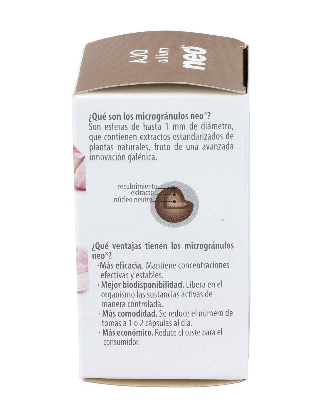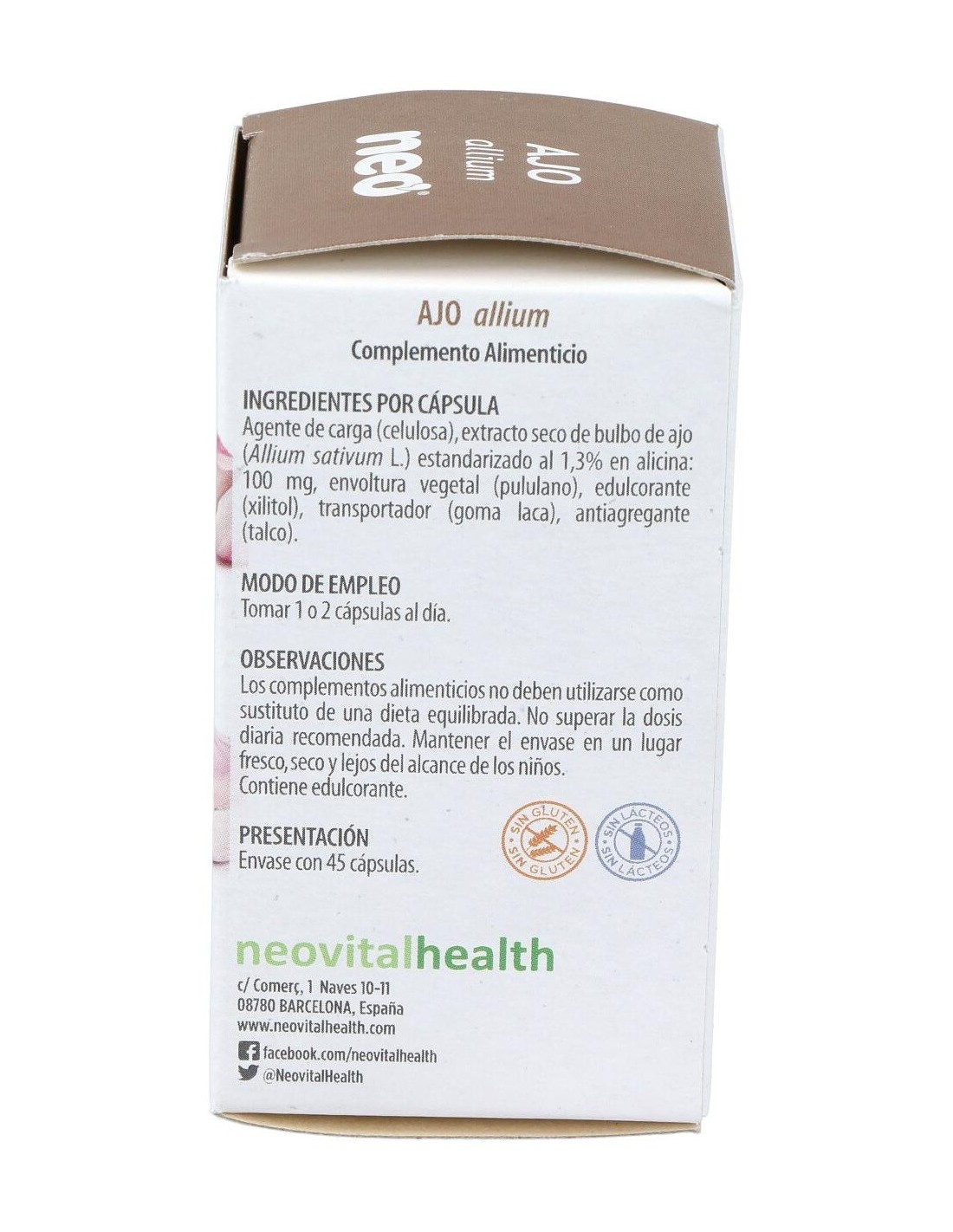 Agente de carga (celulosa), extracto seco de bulbo de ajo (Allium sativum L.) estandarizado al 1,3% en alicina 100 mg, envoltura vegetal (pululano), edulcorante (xilitol), transportador (goma laca), antiagregante (talco).