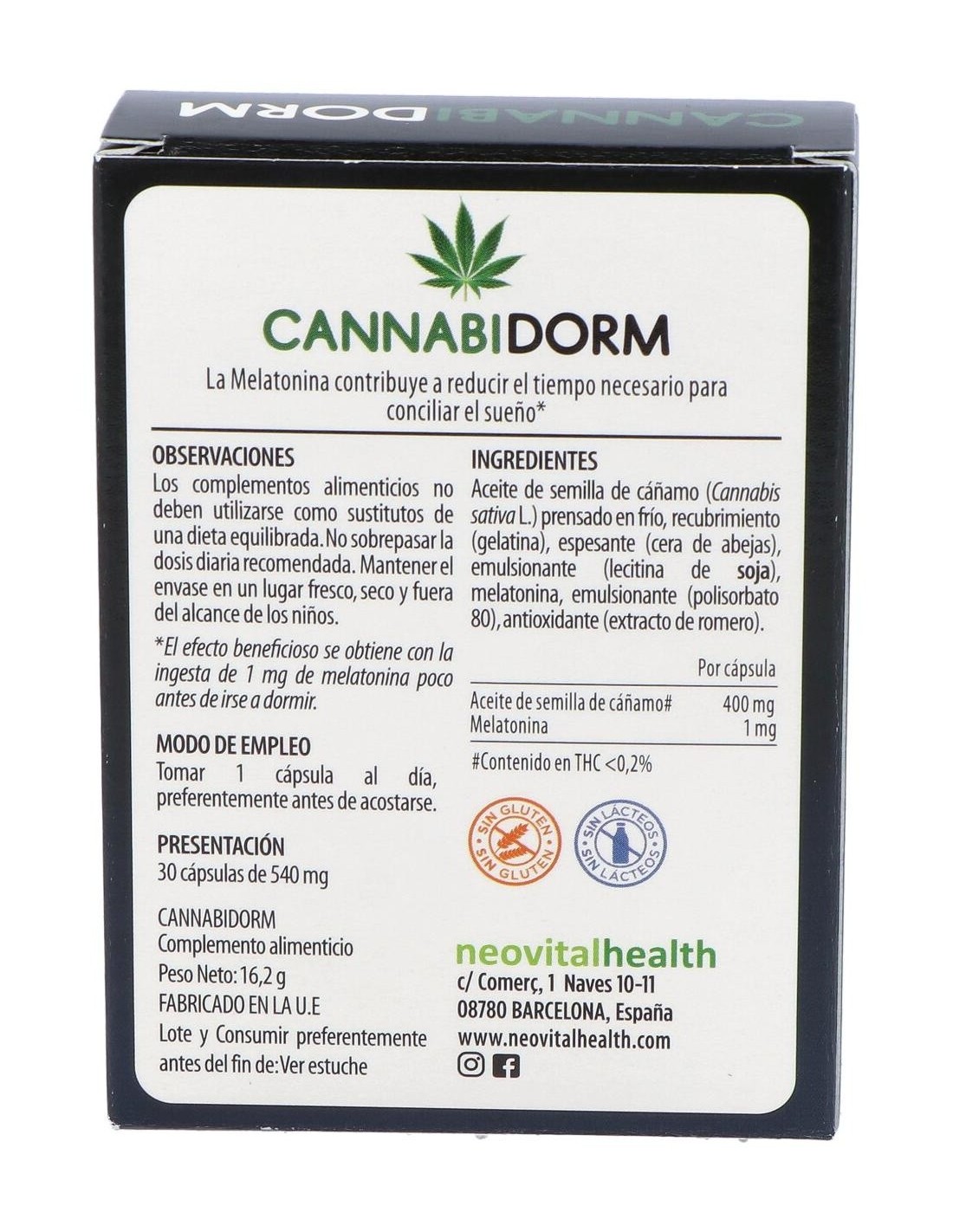 Aceite de semilla de cáñamo (Cannabis sativa L.) prensado en frío*, gelatina, cera de abejas, lecitina de soja, melatonina, polisorbato 80, extracto de romero.