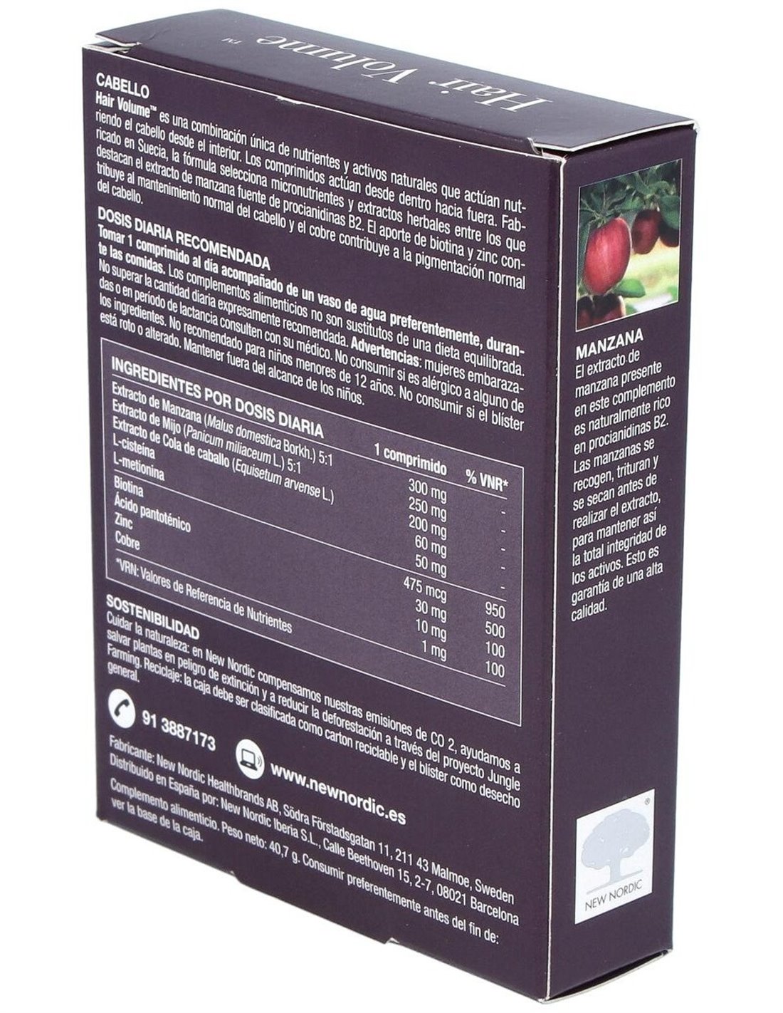 Suplemento alimenticio formulado con Escandinavia, extracto de manzana, procianidina B2 y cola de caballo. Producto destinado a facilitar el cuidado de la belleza del cabello, epidermis y uñas. Además, en la composición encontramos biotina y zinc contribuyen al crecimiento del cabello y el cobre contribuye a conservar la pigmentación normal, retrasando el blanqueamiento del cabello.