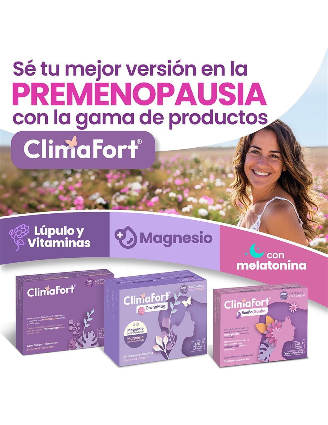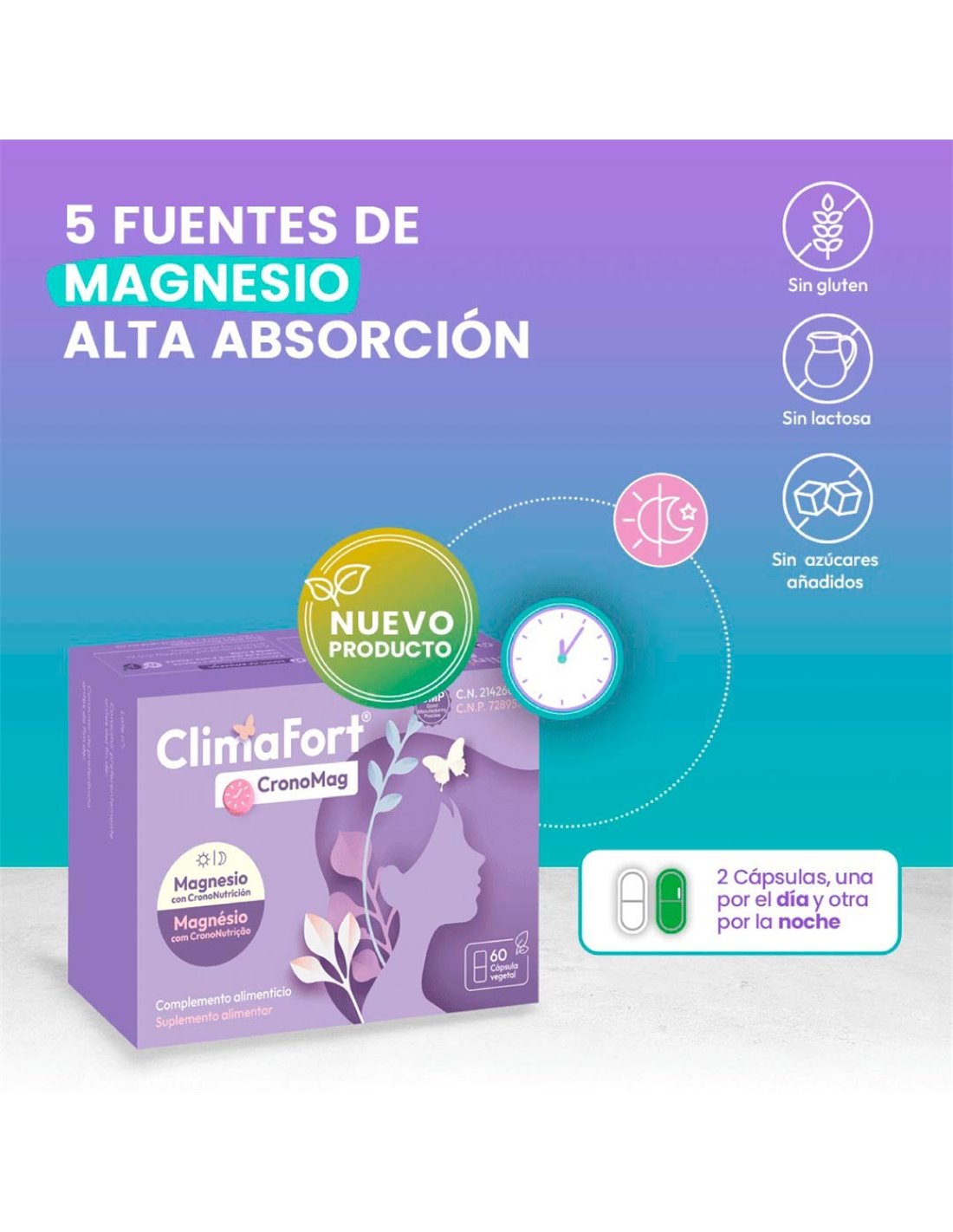 NIAMClimaFort® CronoMag es un complemento alimenticio que ayuda a mujeres en la etapa de la premenopausia y menopausia a mantener unos niveles óptimos de magnesio. Su fórmula única incorpora 5 sales de magnesio cuidadosamente seleccionadas que ayudan a mantenerse activa y motivada durante el día y relajada por la noche. Basado en la crononutrición, aporta los ingredientes específicos necesarios en el momento del día en que son más beneficiosos, aportando mayor capacidad de absorción.