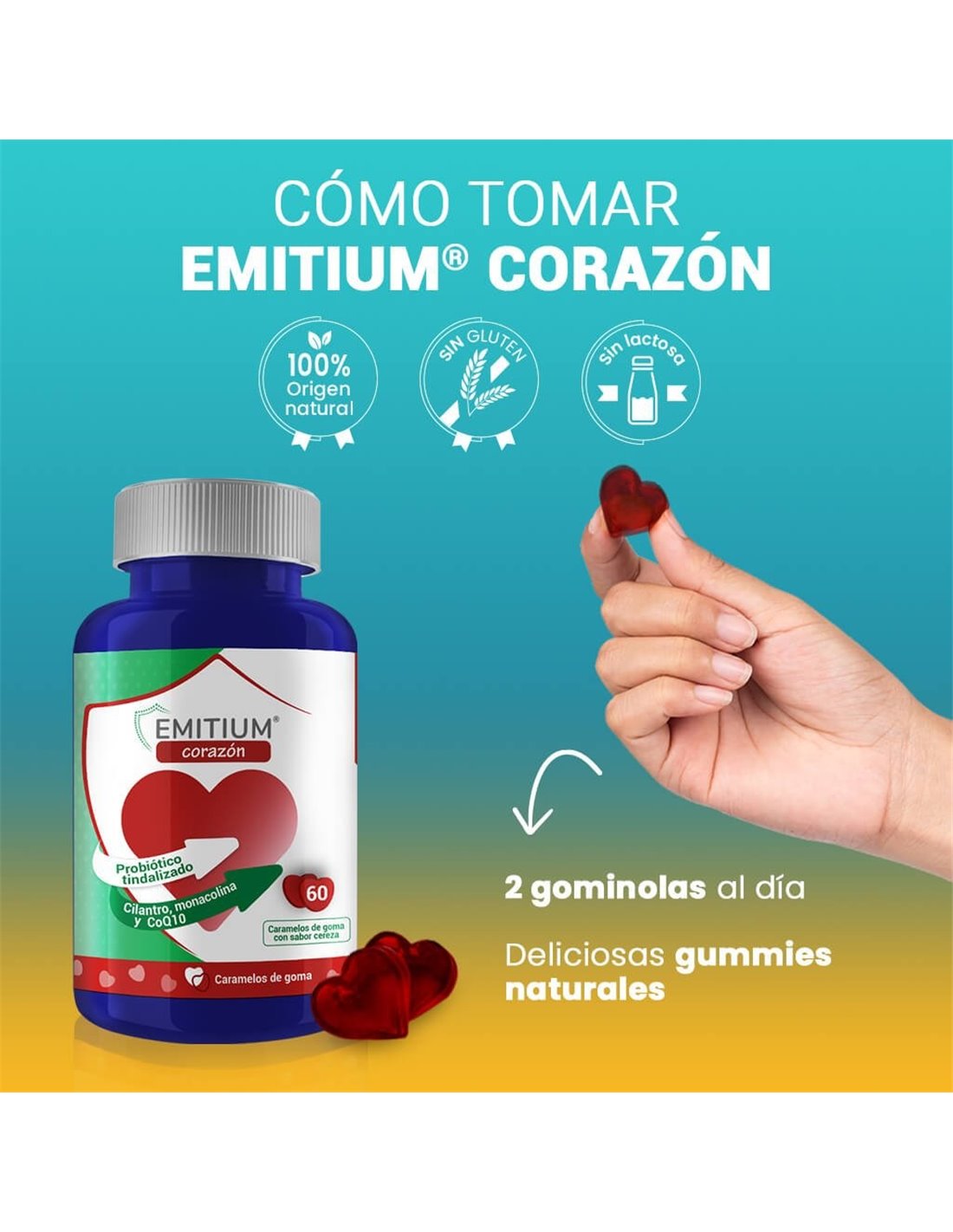 NIAMEMITIUM® Corazón es un complemento alimenticio natural diseñado para ayudar a mantener unos niveles normales de colesterol ya que su formulación en formato gominola con sabor a cereza incluye ingredientes como el cilantro, el arroz de levadura roja y una cepa probiótica. El arroz de levadura roja contribuye a mantener niveles normales de colesterol en sangre. Con acción antioxidante gracias a los polifenoles presentes en el cilantro. Además, la Q10 ayuda a la producción de energía celular.