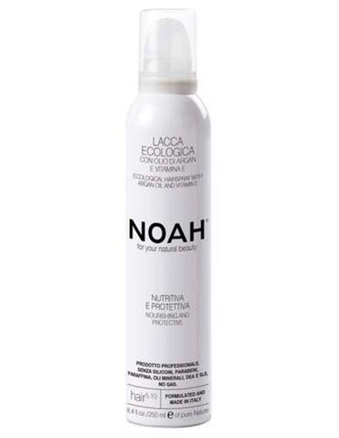 NOAHLaca profesional para el cabello con fijación fuerte, ideal para definir cualquier tipo de peinado. Crea una película abrillantadora y protectora que envuelve el cabello, protegiéndolo de la humedad y el frizz, sin apelmazar.Gracias a la presencia del aceite de Argán, con propiedades antioxidantes e hidratantes, y de la vitamina E, reestructura la película lipídica y aporta brillo. al cabello Se fija al instante con una acción duradera. No deja residuos incluso si se usa varias veces al día. Se elimina fácilmente con un cepillo. Vaporización ultrafina y uniforme. Sin propulsores. El producto NO contiene Siliconas, Parabenos, Parafina, Aceites Minerales, DEA y SLS.