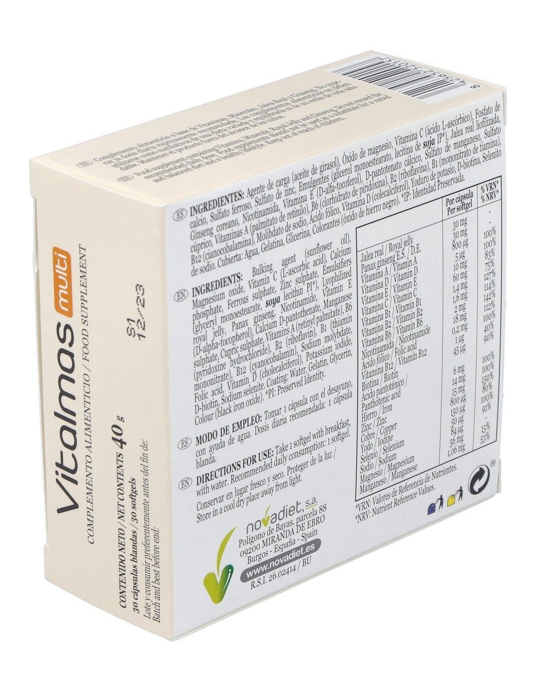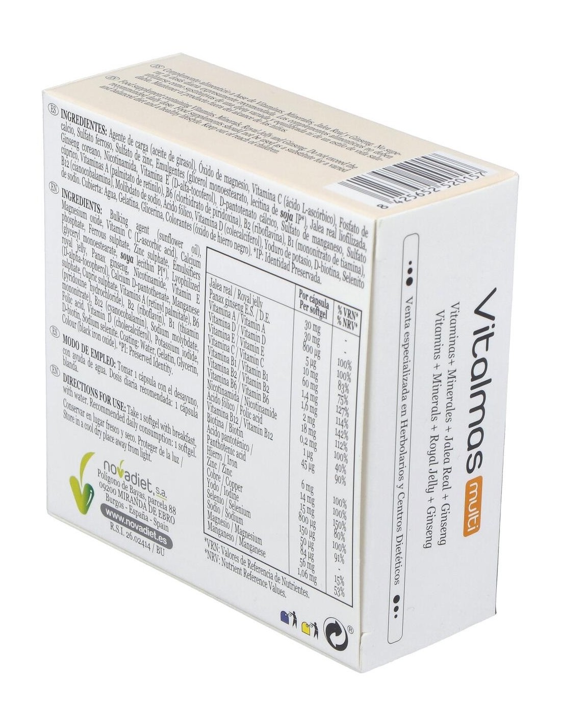 Agente de carga (aceite de girasol), Óxido de magnesio, Vitamina C (ácido L ascórbico), Fosfato de cálcio, Sulfato ferroso, Sulfato de zinc, Emulgentes (glicerol monoestearato, lecitina de soja IP*), Jalea real liofilizada, Extracto de ginseng coreano, Nicotinamida, Vitamina E (D-alfa-tocoferol), D-pantotenato cálcico, Sulfato de manganeso, Sulfato cúprico, Vitaminas A (palmitato de retinilo), B6 (clorhidrato de piridoxina), B2 (riboflavina), B1 (mononitrato de tiamina), B12 (cianocobalamina), Molibdato de sodio, Ácido fólico, Vitamina D (colecalciferol), Yoduro de potasio, D-biotina, Selenito de sodio. Cubierta: Agua, Gelatina, Glicerina, Colorantes (óxido de hierro negro, dióxido de titanio, Patent blue).