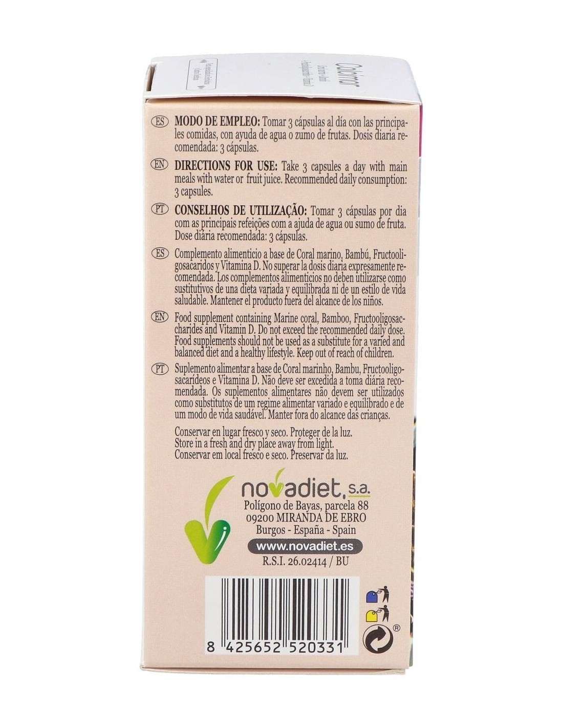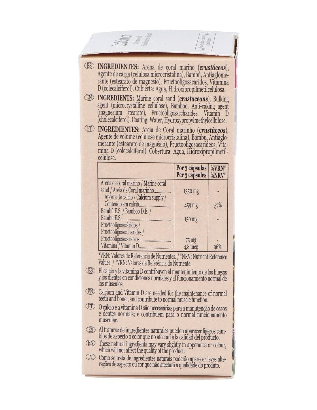 Arena de coral marino (crustáceos), Agente de carga (celulosa microcristalina), Bambú, Antiaglomerante (estearato de magnesio), Fructooligosacáridos, Vitamina D (colecalciferol). Cubierta: Agua, Hidroxipropilmetilcelulosa.