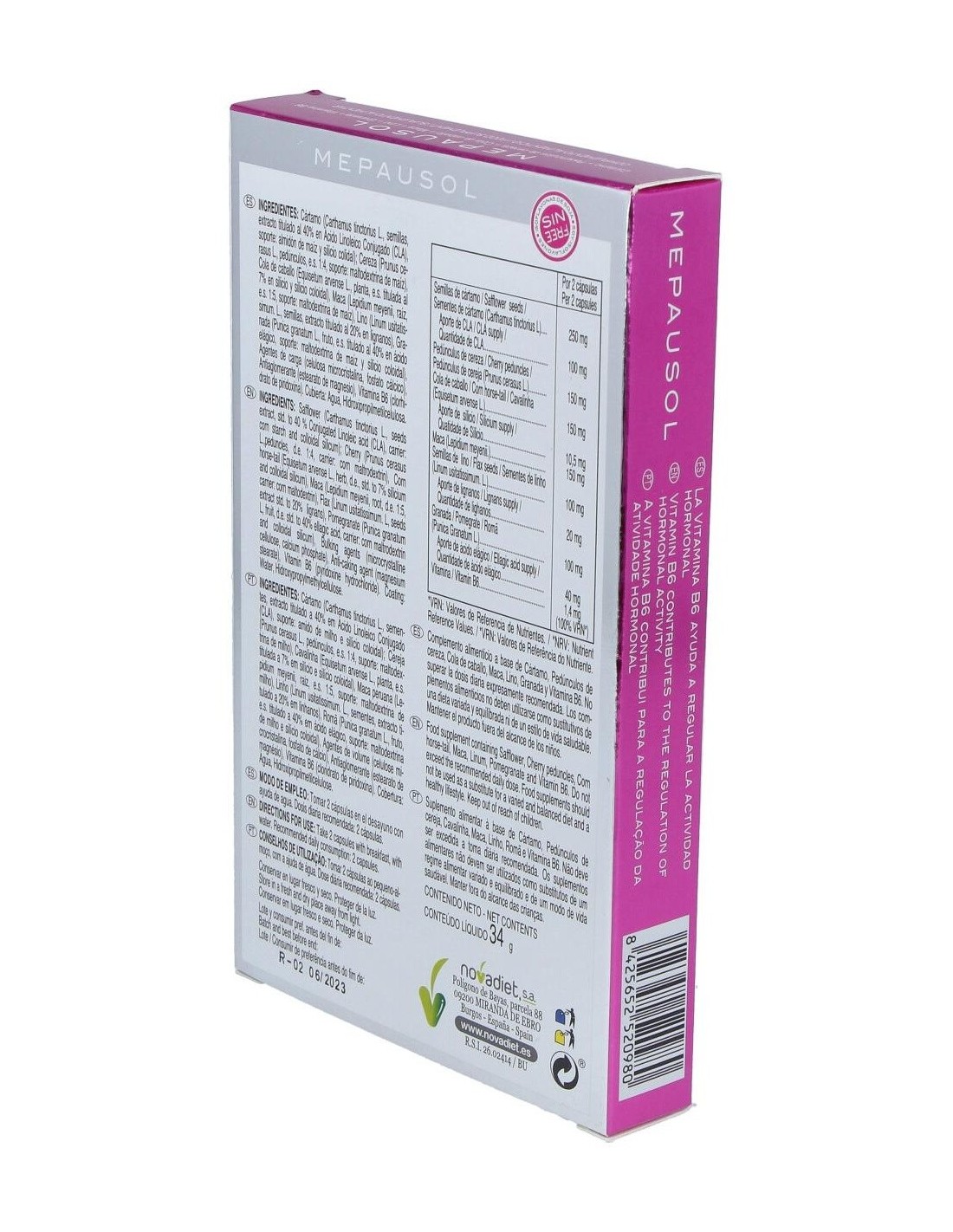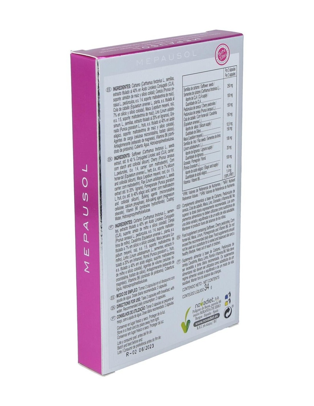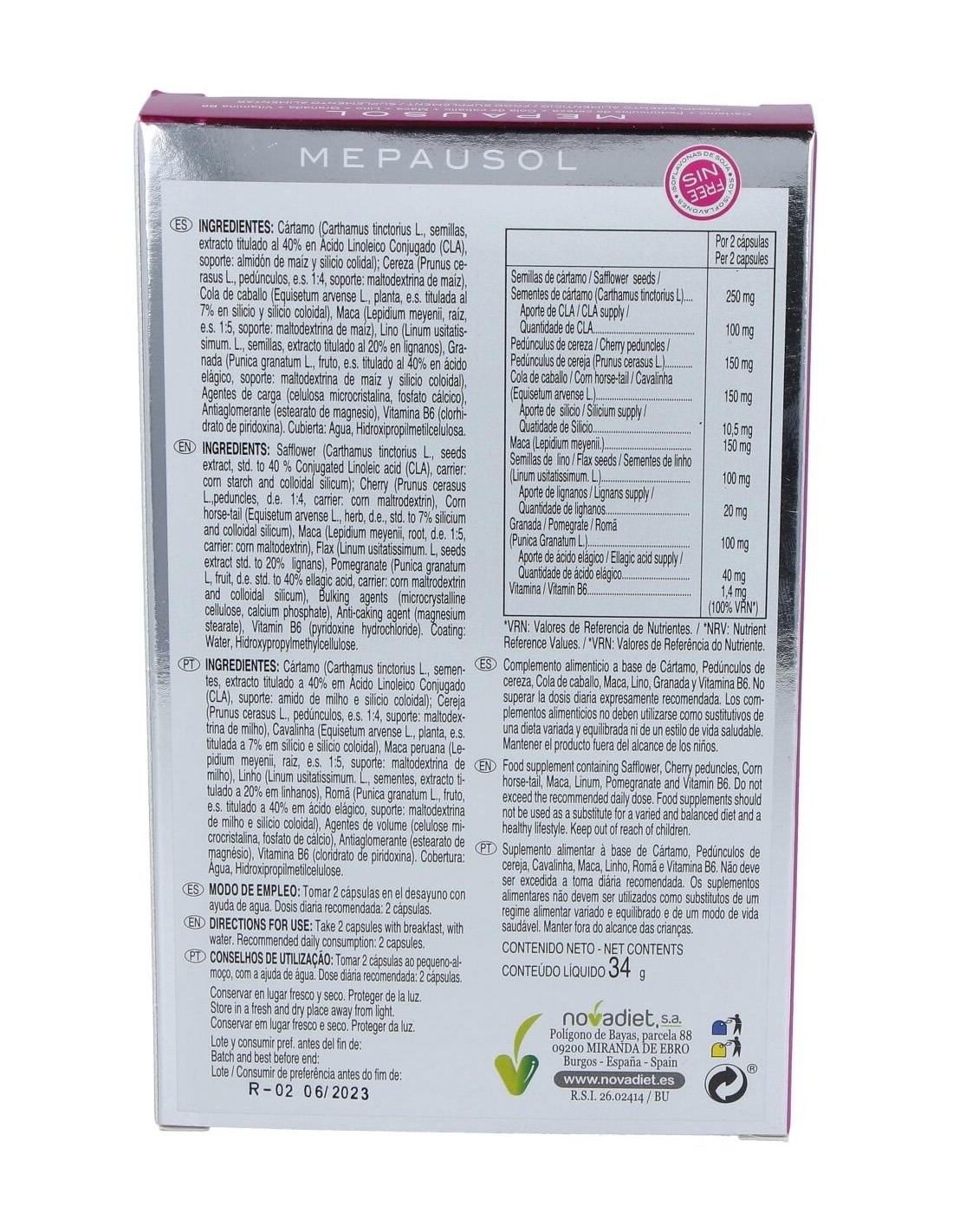 Cártamo (e.s., titulado al 40% en ácido linoleico conjugado -CLA-), Cereza (e.s., ratio 1:4), Cola de caballo (e.s., titulado al 7% en silicio y silicio coloidal), Maca (e.s., ratio 1:5), Lino (e.s., titulado al 20% en lignanos), Granada (e.s., titulado al 40% en ácido elágico), Agentes de carga (celulosa microcristalina, fosfato cálcico), Antiaglomerante (estearato de magnesio), Vitamina B6 (clorhidrato de piridoxina). Cubierta: Agua, Hidroxipropilmetilcelulosa.