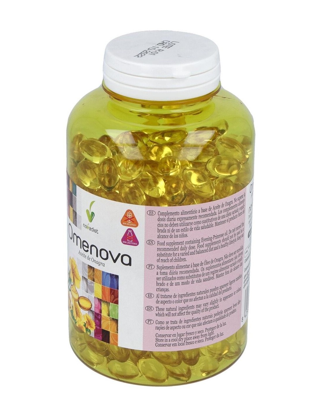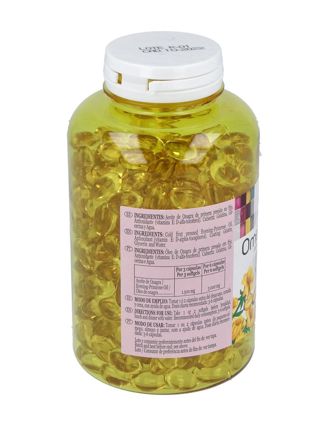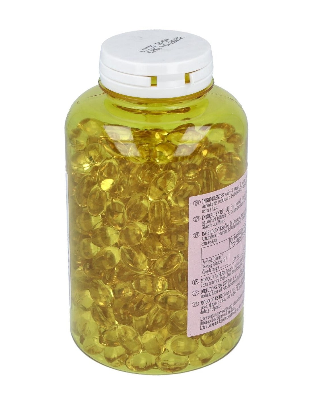 Aceite de Onagra de primera presión en frío, Antioxidante (vitamina E: D-alfa-tocoferol). Cubierta: Gelatina, Glicerina y Agua.