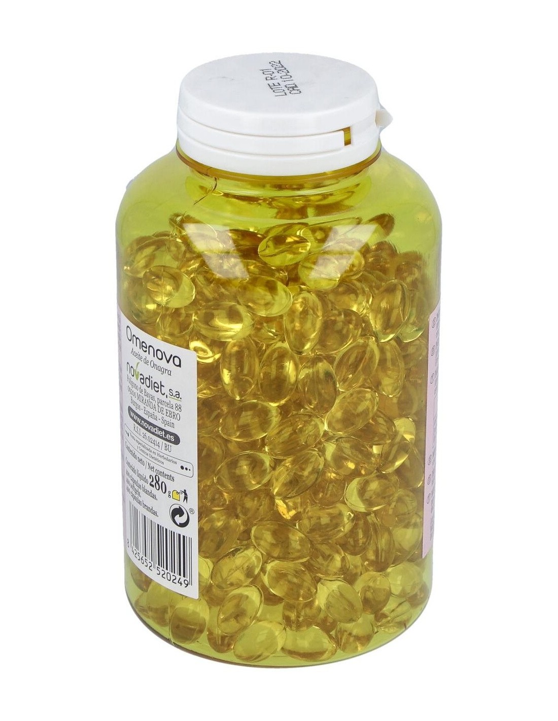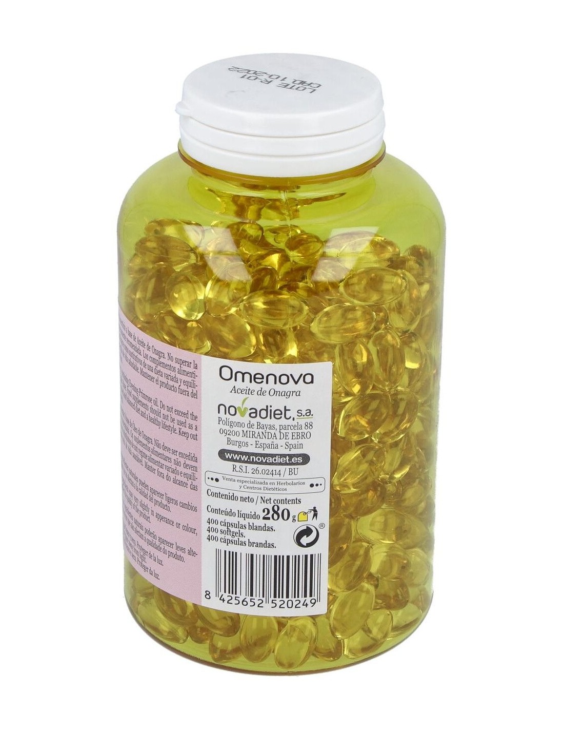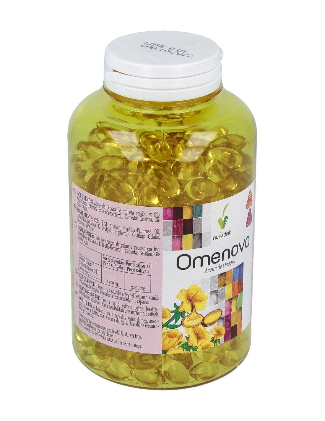 Aceite de Onagra de primera presión en frío, Antioxidante (vitamina E: D-alfa-tocoferol). Cubierta: Gelatina, Glicerina y Agua.