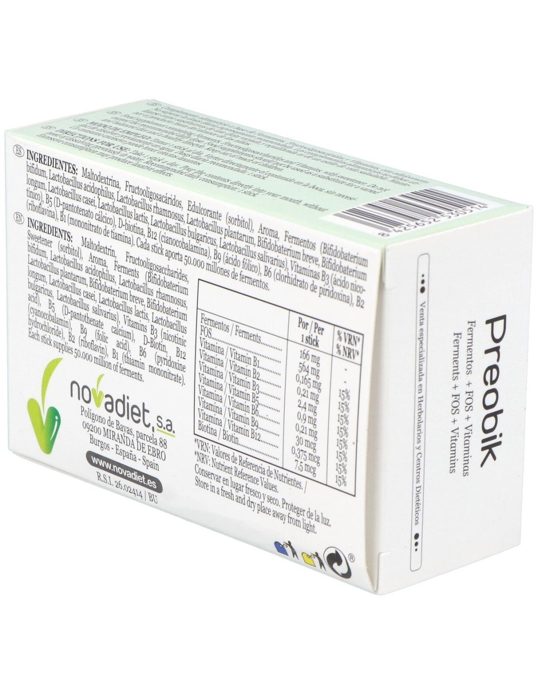 Los sticks Novadiet Preobik son una fuente importante de probióticos para tu cuerpo que te ayudarán a mantener la salud de la flora intestinal, ayudando a las digestiones, favoreciendo la absorción de nutrientes, reforzando el sistema inmunitario, reduciendo los gases e hinchazón , neutralizando las sustancias tóxicas y protegiendo contra las infecciones intestinales.