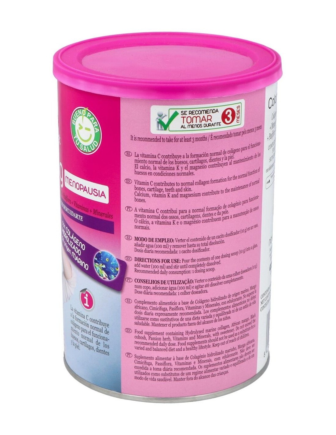 Colágeno hidrolizado de origen marino (pescado), Maltodextrina, Acidulante (ácido cítrico), Óxido de magnesio, Carbonato de calcio, Aroma, Pasiflora (E.S. titulado a >2% en flavonoides totales expresados como vitexina), Mango africano (E.S. 10:1), Zumo de remolacha en polvo, Vitamina C (ácido L-ascórbico), Antiaglomerante (dióxido de silicio), Levadura enriquecida con selenio, Cimicífuga (E.S. 10-14:1), Edulcorante (sucralosa), Vitamina K (menaquinona), Vitamina D (colecalciferol).