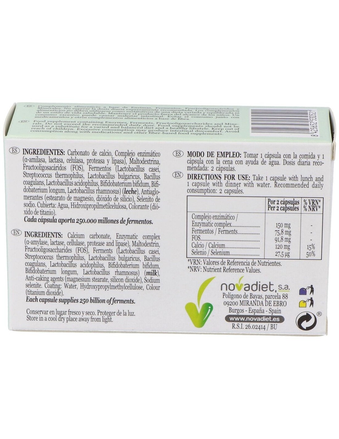 Carbonato de calcio, Complejo enzimático (a-amilasa, lactasa, celulasa, proteasa y lipasa), Maltodextrina, Fructooligosacáridos (FOS), Fermentos (Lactobacillus casei, Streptococcus thermophilus, Lactobacillus bulgaricus, Bacillus coagulans, Lactobacillus acidophilus, Bifidobacterium bifidum, Bifidobacterium longum, Lactobacillus rhamnosus), Antiaglomerantes (estearato de magnesio, dióxido de silicio), Selenito de sodio. Cubierta: Agua, Hidroxipropilmetilcelulosa, Colorante (dióxido de titanio). Cada cápsula aporta 250.000 millones de fermentos.